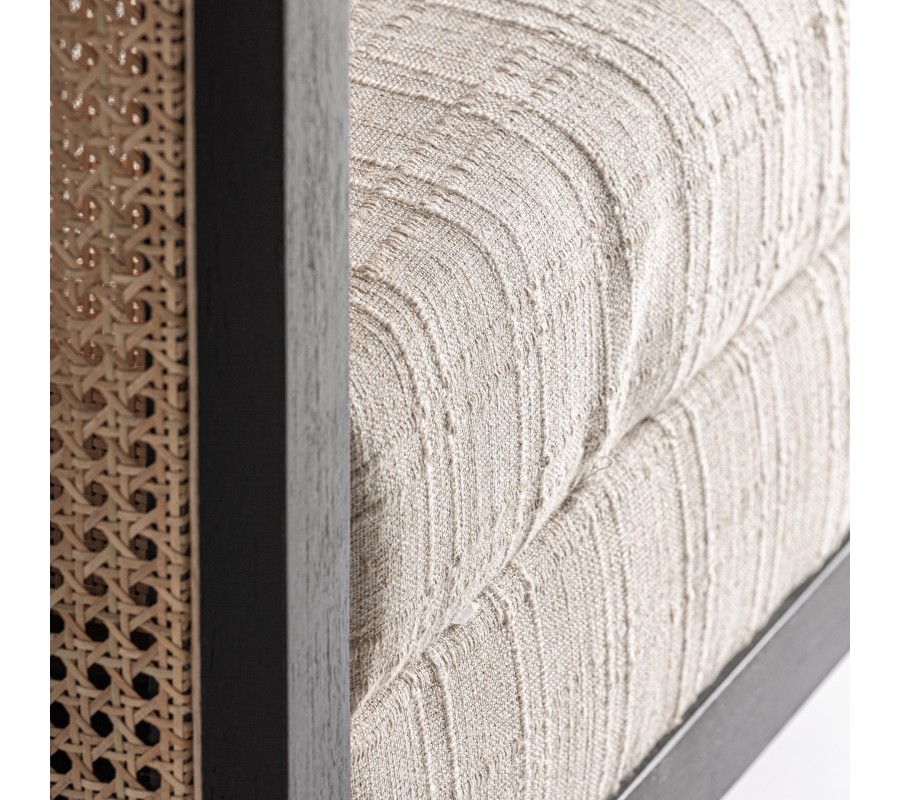 Sedacia časť je čalúnená príjemnou látkou z mikrovlákna v krémovej farbe s jemným štruktúrovaným vzorom a vyplnená penou, ktorá poskytuje pohodlnú a stabilnú oporu pri každodennom používaní. Kombinácia mangového dreva, ratanového výpletu a textilného čalúnenia zabezpečuje pevnosť konštrukcie aj komfortné sedenie.