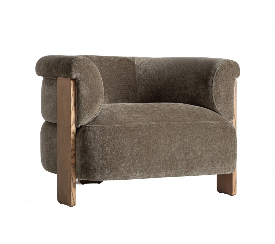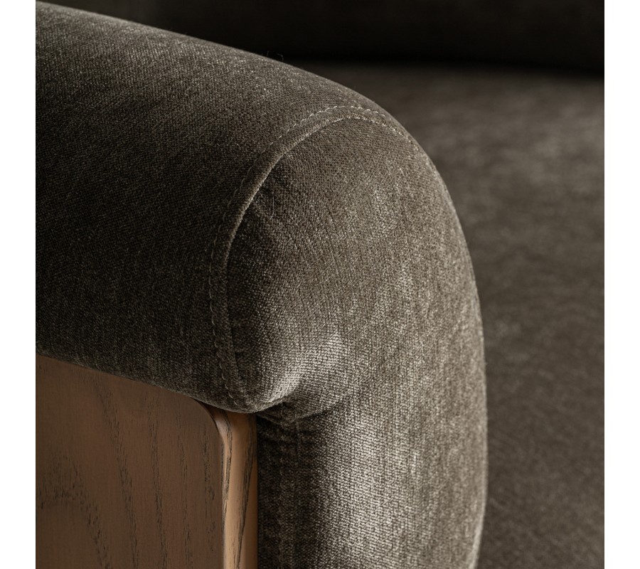 Kreslo má kompaktný, architektonicky tvarovaný profil, kde sú bočné opierky plynulo prepojené s operadlom chrbta. Tento oblý rám vytvára príjemne obopínajúci tvar, ktorý podporuje pohodlné sedenie. Hrubé čalúnené sedadlo dodáva kreslu výrazný objem a komfort.