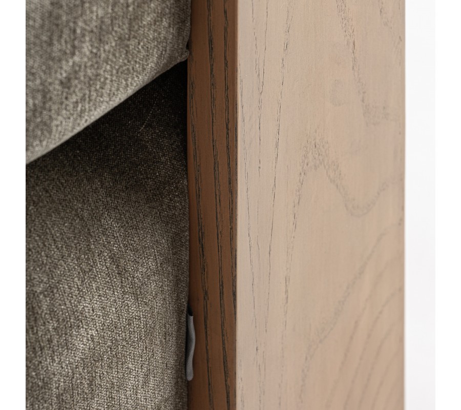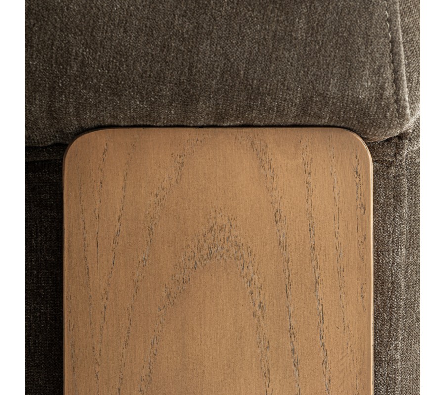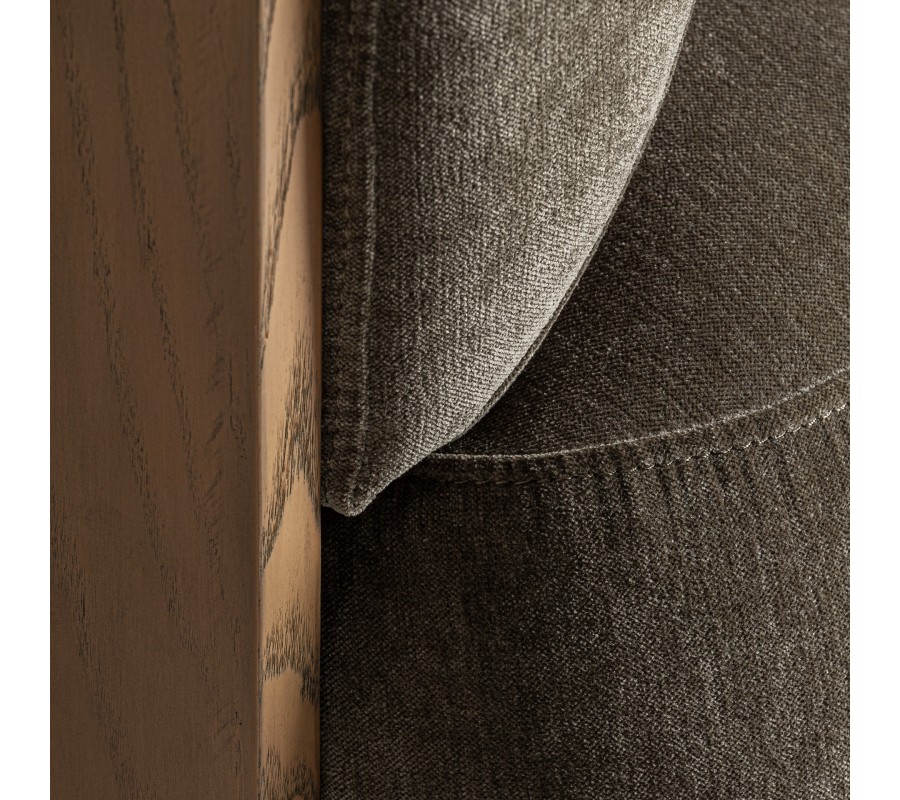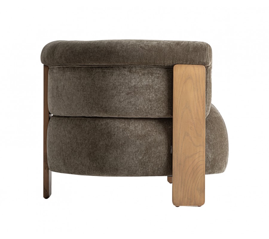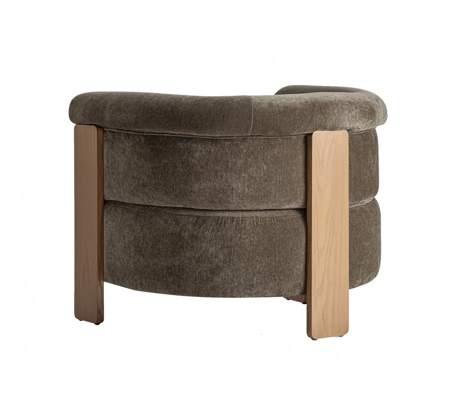 Zaujímavým detailom je aj zadná strana operadla, ktorá je tvorená dvomi mäkko čalúnenými horizontálnymi segmentmi. Tento prvok zvýrazňuje objem kresla a dodáva mu výrazný plastický charakter. Stabilitu zabezpečujú tri ploché drevené nohy s prirodzenou kresbou dreva, ktoré vytvárajú príjemný kontrast s mäkkým čalúnením.