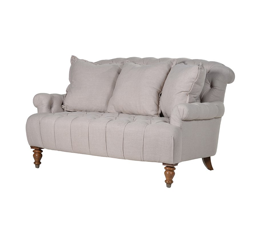 Štýlová prešívaná dvojsedačka v Chesterfield štýle s prírodným ľanovým čalúnením bude dokonalým doplnkom romantických, vidiecky ladených interiérov. Súčasťou sedačky sú taktiež pohodlné vankúše.