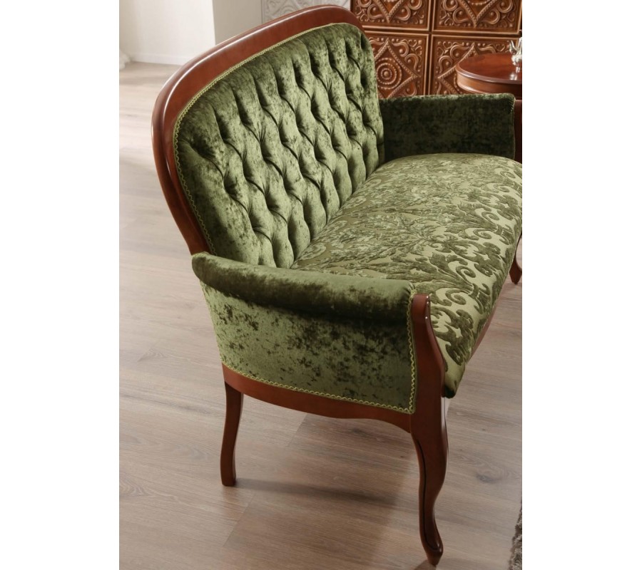 Luxusná masívna pohovka z kolekcie nábytku CASTILLA na prvý pohľad očarí svojim honosným vzhľadom a eleganciou. Celá konštrukcia je vyhotovená z masívu bukového dreva, ktoré zabezpečuje vysokú trvácnosť, a doplnená lesklým čalúnením zo zamatu, vďaka ktorému sa sedenie na tejto pohovke stane mimoriadne pohodlným a príjemným. Rovnako ako všetok nábytok kolekcie CASTILLA, je možné aj túto pohovku vyhotoviť v štyroch farbách podľa vzorkovníka dreva, a doplniť jedným z ôsmich dostupných čalúnení. Zadnú opierku možno ponechať hladkú, alebo doplniť drukmi.
