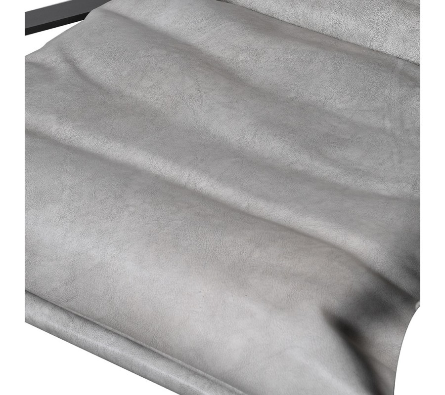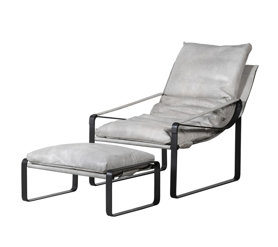 Luxusná leňoška Lounge v sivom koženom čalúnení s čiernymi kovovými operadlami s dizajnovou taburetkou 91cm