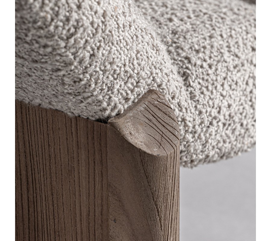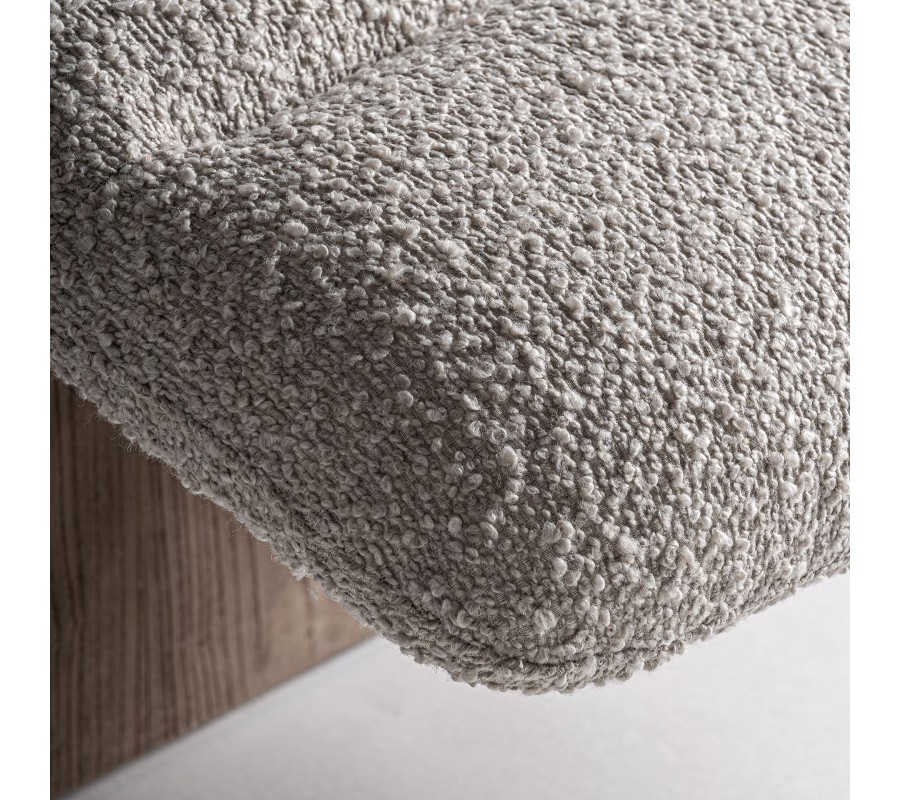 Stabilitu a vizuálnu oporu zabezpečujú dve priečne uložené nožičky z masívneho dreva v svetlom dubovo hnedom odtieni, ktoré sú medzi sebou pevne prepojené stredovou výstužou. Viditeľná štruktúra dreva, jemné nerovnosti, uzly či rozdiely v odtieni podčiarkujú jeho autentickosť a ručné spracovanie, ktoré je typické pre exkluzívny nábytok tejto kvality.