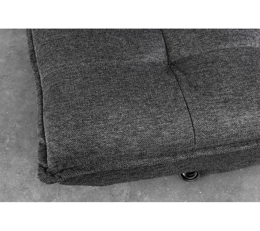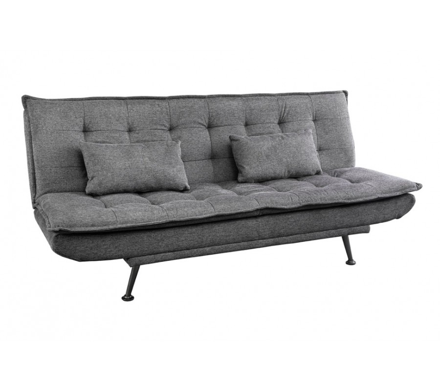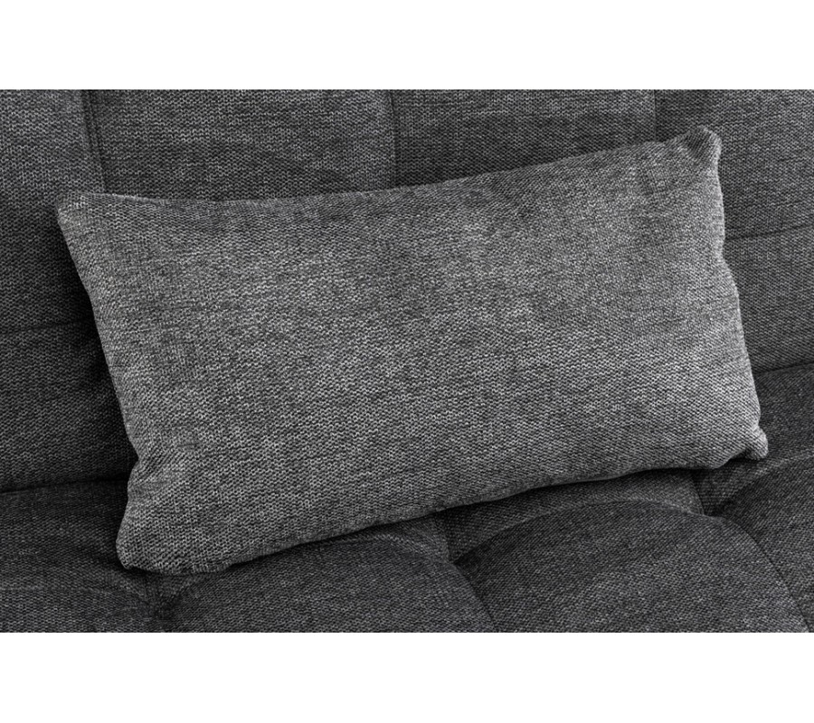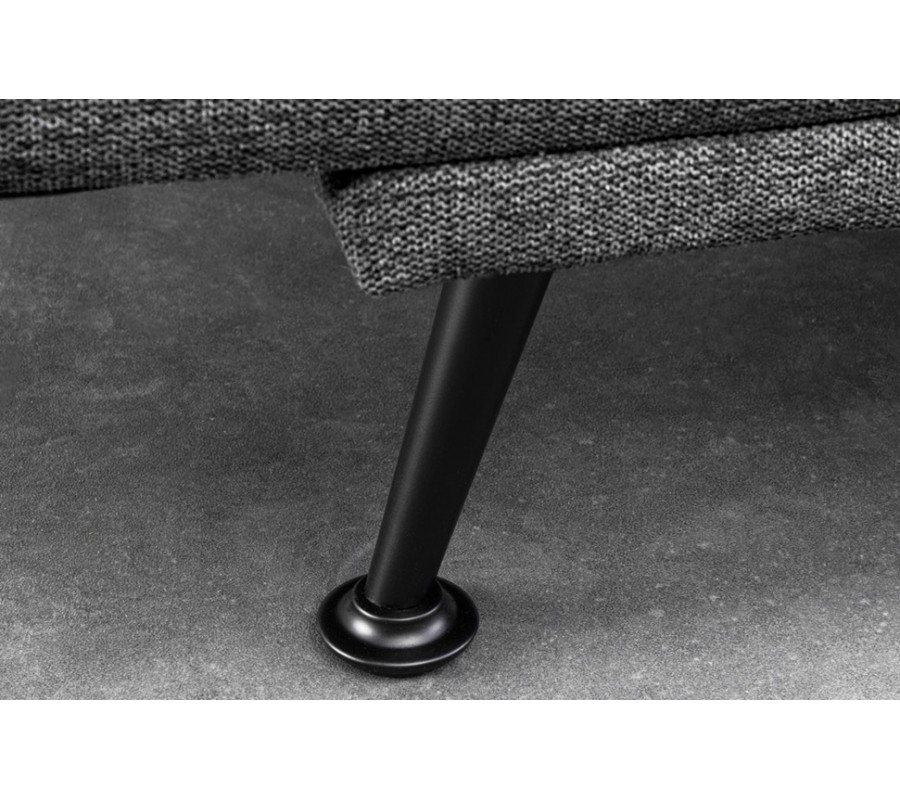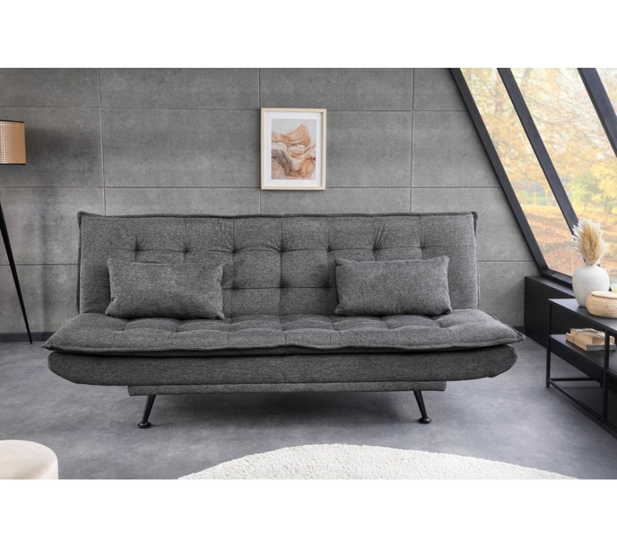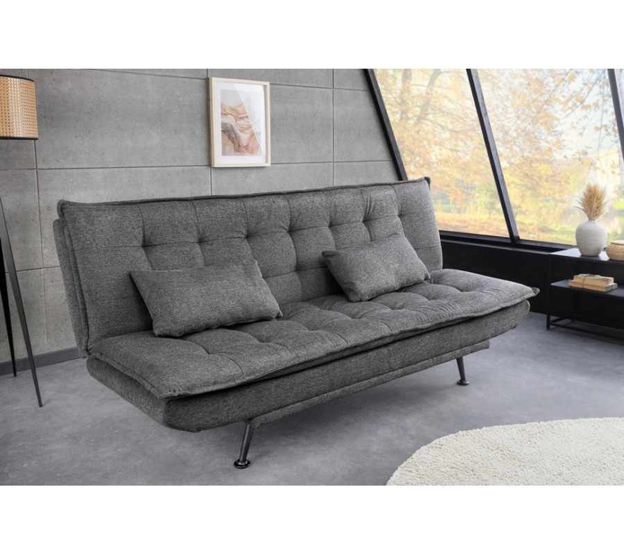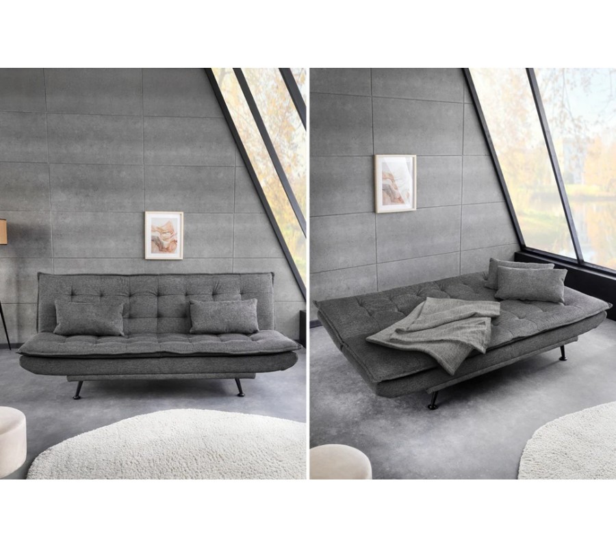 Vďaka rozkladacej funkcii možno sedačku jednoducho premeniť na pohodlné lôžko vhodné na príležitostné prespanie alebo denný relax. Komfort zvyšujú dva obdĺžnikové vankúše, ktoré poskytujú dodatočnú oporu chrbta a zároveň esteticky dopĺňajú celkový dizajn. Stabilitu zabezpečuje pevná spodná konštrukcia doplnená o štyri jemne skosené kovové nožičky v čiernej farbe, ktoré vytvárajú kontrast k sivému čalúneniu a dodávajú sedačke moderný akcent.