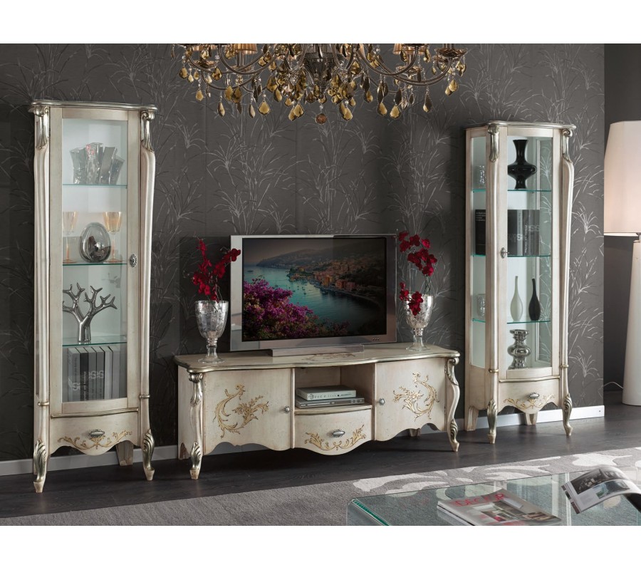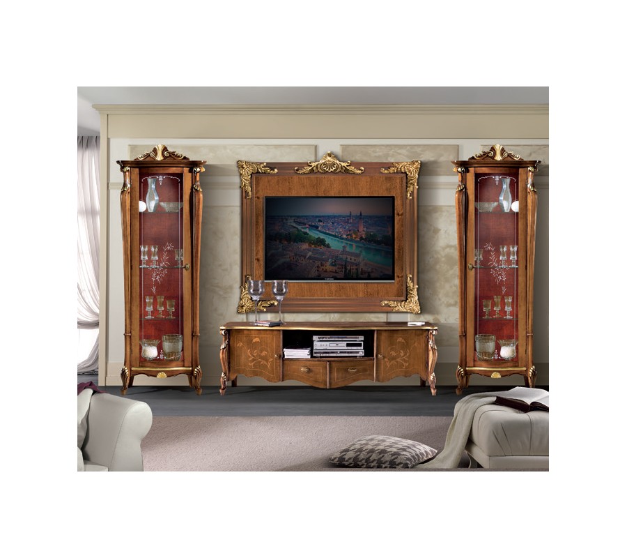 Luxusná kolekcia Pasiones predstavuje rustikálny drevený nábytok s historizujúcim efektom, ktorý Vášmu bývaniu dodá klasický nádych. Obývacia stena Pasiones ponúka klasické vitríny v rustikálnom štýle s ručne vyrezávanými detailmi a maľovanou výzdobou vo vintage zlatej farbe. Vyrezávané dekorácie po stranách vitrín plynule prechádzajú do chippendale nožičiek a vytvárajú tak rovnomerný dizajnový prvok. V obývacej zostave Pasiones rovnako nájdete luxusný rustikálny TV stolík s dvierkami, dvomi zásuvkami a poličkou, dizajnovo upravený rovnakými ručne vyrezávanými prvkami aké zdobia vitríny. Dominantnou súčasťou obývacej steny Pasiones je luxusná masívna zástena za TV s neprehliadnuteľnými ornamentálnym ručným vyrezávaným vo vintage zlatej farbe. Klasický nábytok z kolekcie Pasiones je vyrobený z masívneho dreva, ktoré je povrchovo upravené ručným vyrezávaním a intarziami. Masívny nábytok Pasiones odporúčame kombinovať s ostatným klasickým talianským nábytkom menovite kolekciami Clasica, Pasiones či Emociones.