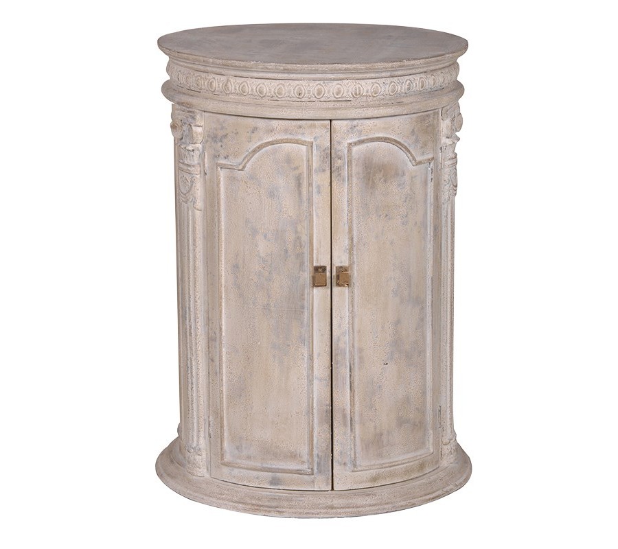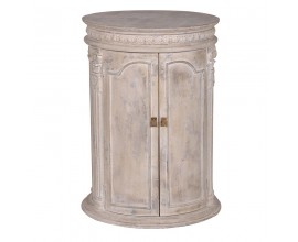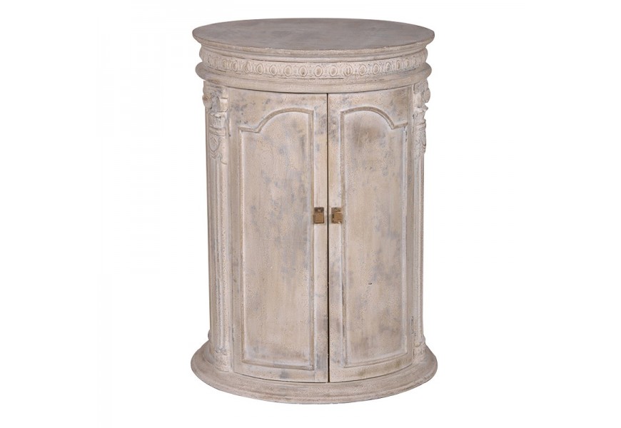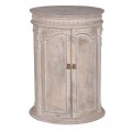 Vintage kruhová skrinka Manolia z dreva a živice v pieskovej farbe s dvomi poličkami s dvierkami 72cm
