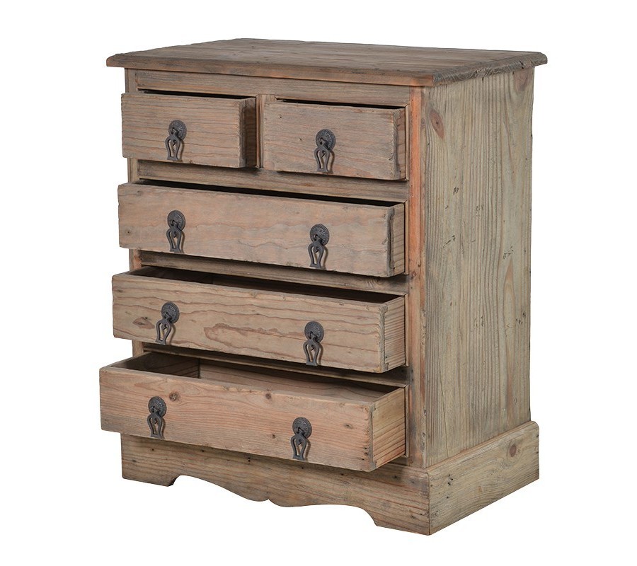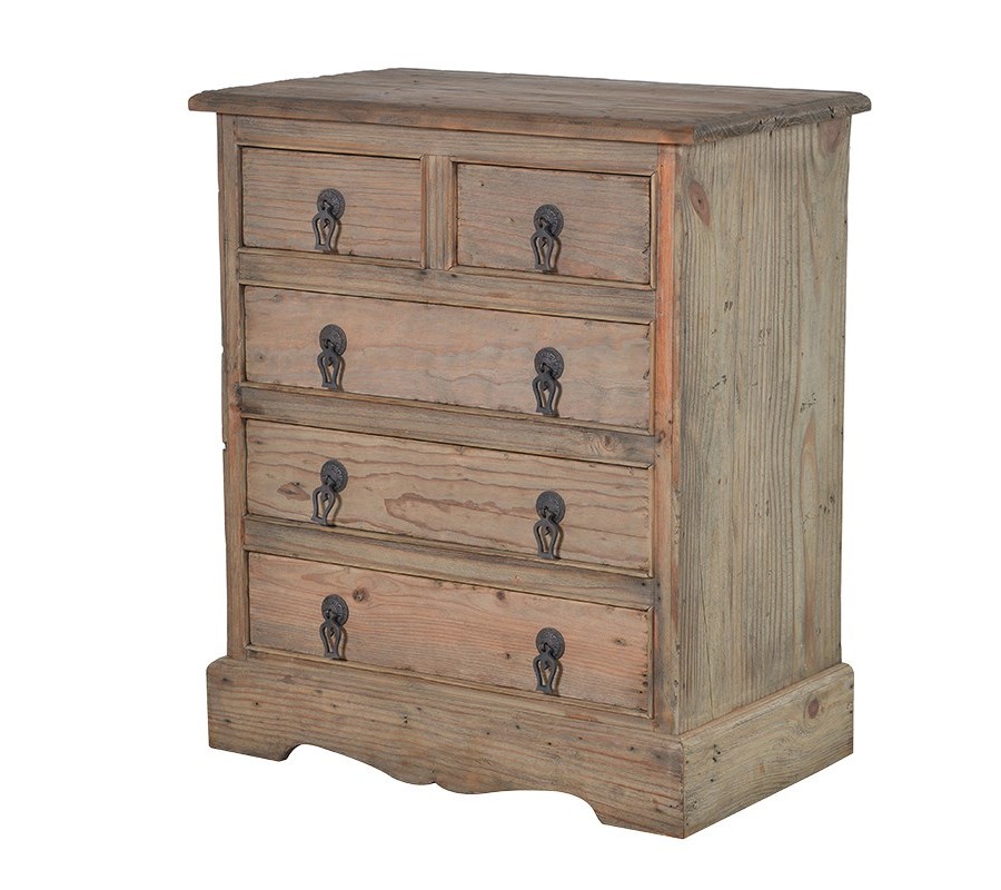 Štýlová masívna komoda KOLONIAL s piatimi zásuvkami a výraznými úchytkami, je vyrobená z kvalitného masívneho dreva s hrubou povrchovou úpravou, ktoré ho radia do vintage, prípadne do vidieckeho štýlu. Prírodný vzhľad dreva dodá interiéru štýl a nádych prírody. Doplňte ho ďalšími štýlovými kúskami kolekcie nábytku KOLONIAL.