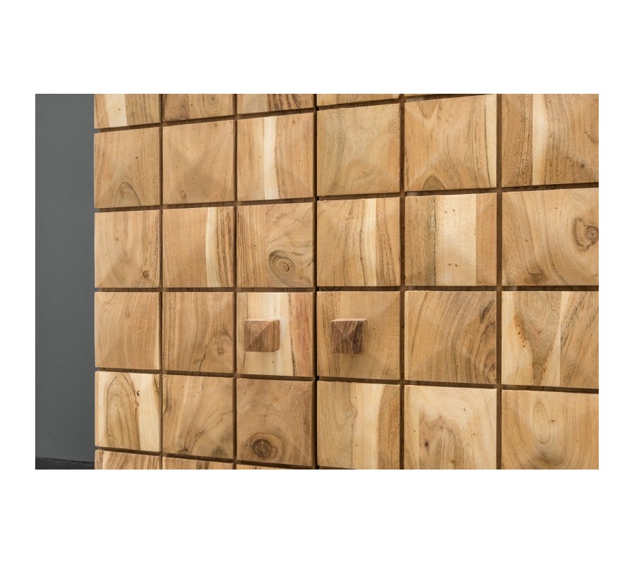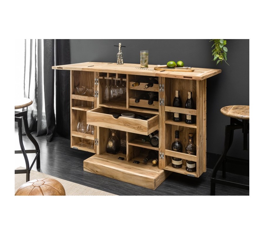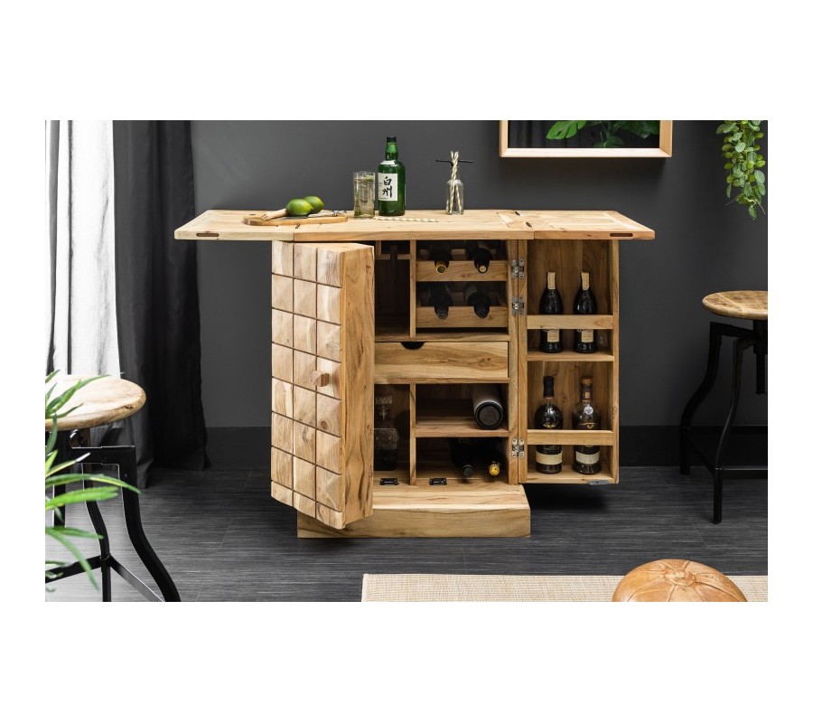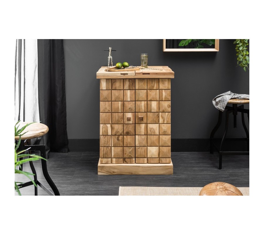 Jedinečná barová skrinka Seal je vyrobená z masívneho akáciového. Ide o kúsok, ktorá vo vašom interiéri skutočne vynikne, a to najmä vďaka zaujímavého dizajnu a geometrickým vzorom na dvierkach. Skrinka disponuje viacerými poličkami a poskytuje tak dostatok miesta na alkohol i poháre. Vďaka príjemným, svetlým naturálnym tónom dreva vám do vášho domova prinesie nádych prírody a zaručene vašu miestnosť rozžiari. Skvelo vynikne v kombinácii s masívnym nábytkom a s doplnkami vo výraznejších farbách, napríklad v zelenej či červenej, ale hodí sa aj do tmavšie ladených interiérov.