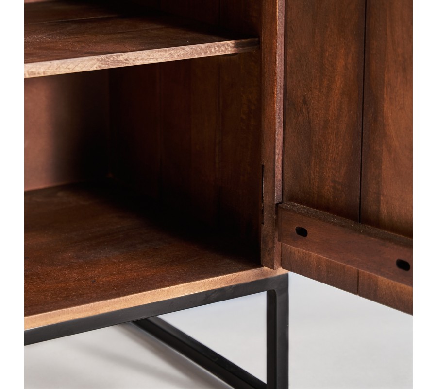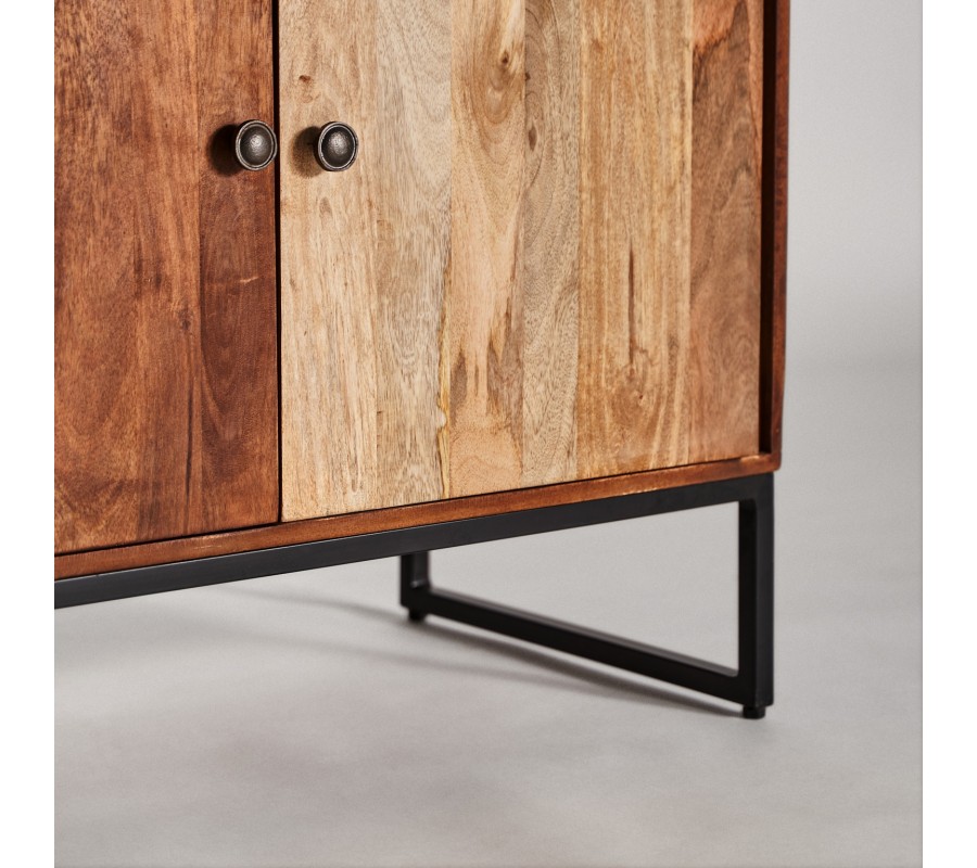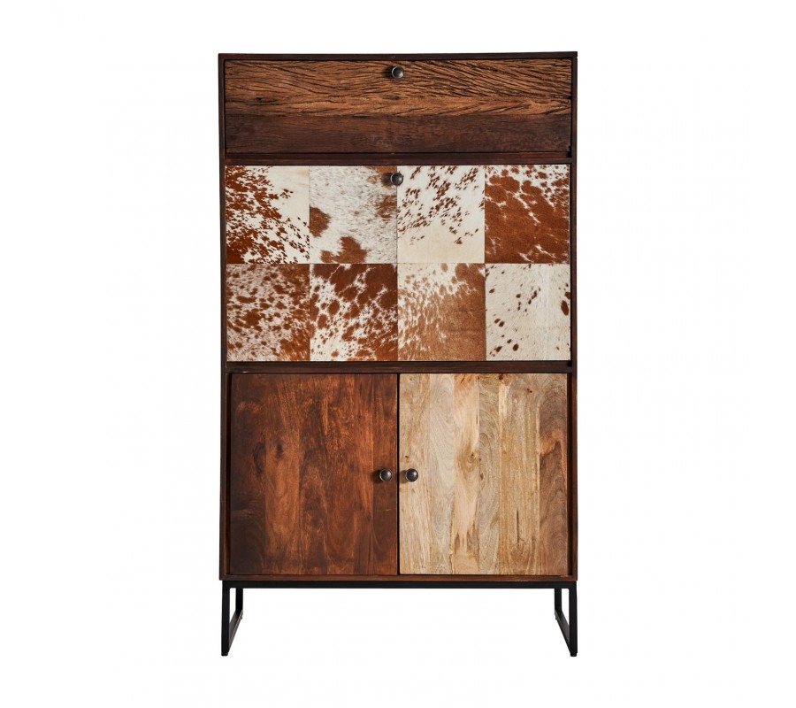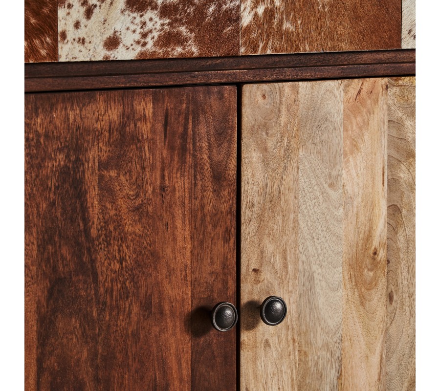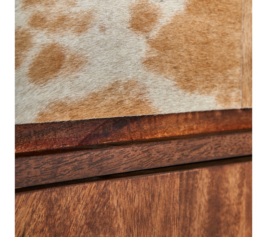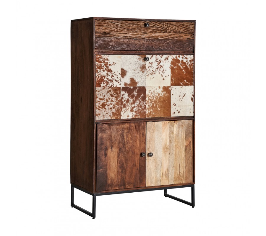 Barová skrinka z kolekcie masívneho nábytku Texas zaujme svojím dizajnovým prevedením prepájajúcim vidiecky, retro a industriálny štýl. Disponuje bohatým úložným priestorom, ktorý možno vhodne využiť umiestnením v obývačke či v kancelárii. Úložný priestor pozostáva z dvoch poličiek s otváracími dvierkami a jednou veľkou a jednou menšou poličkou s dvierkami vyklápacími. Telo skrine je vyrobené z masívneho mangového dreva a nesie sa vo viacerých odtieňoch hnedej. Strednú časť zdobí poťah so zvieracím motívom pripomínajúci kravskú či konskú kožu, čo vyvoláva atmosféru cowboyských či westernových filmov. Prírodný materiál dopĺňa čierna kovová podstava s industriálnym nádychom. Celkový dizajn barovej skrinky Texas pôsobí štýlovo a vkusne a vhodne doladí vidiecke i retro ladené priestory obývačiek, ale i víkendových chatiek či zrubov obkladaných masívnym drevom.