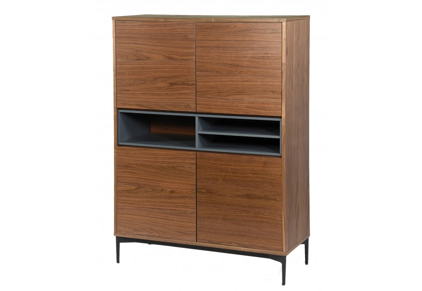Moderná komoda z kolekcie nábytku Vidar sa pýši naturálnym dreveným prevedením, ktoré vďaka svojím kovovým prvkom naberá jemný nádych industriálneho štýlu. Prirodzené prevedenie dreva je dosiahnuté vďaka dyhovaniu z orechového dreva, čo vyzdvihne kresbu a štruktúru na povrchu. Tmavo hnedé drevo je doplnené čiernymi prvkami v podobe podstavy so štyrmi nožičkami a otvoreným úložným priestorom v strede komody. Okrem otvorených poličiek disponuje škandinávska komoda aj štyrmi dvierkami, fungujúcimi na "push" mechanizmus, kde sa dvierka pri stlačení otvoria. Jednoduché línie a ostré hrany modernej komody Vidar vyniknú s nábytkom z kolekcie Vidar alebo s tmavým dreveným nábytkom vo svetlo zariadených interiéroch, kde tmavá hnedá oživí farebné prevedenie vášho interiéru.