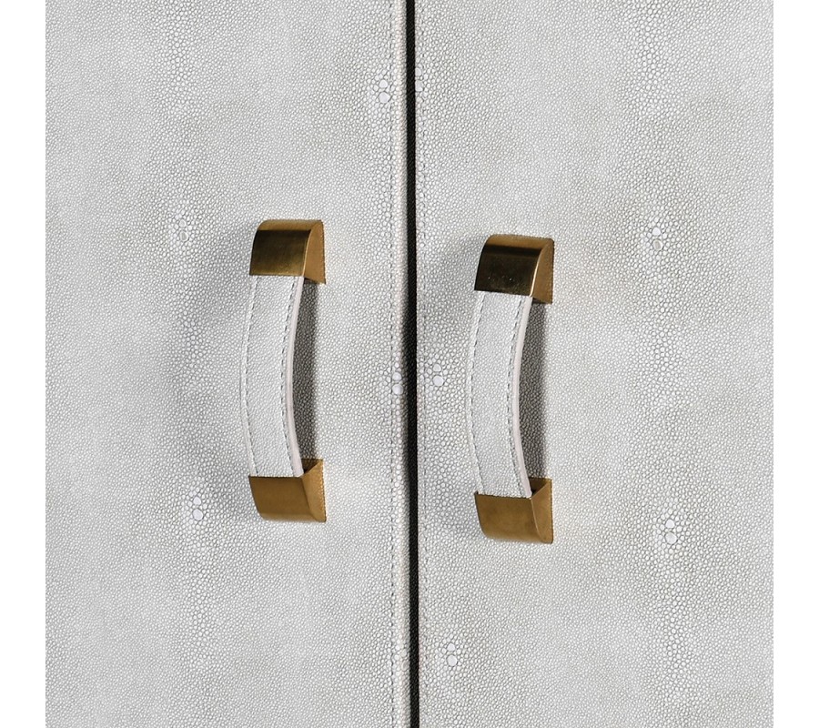 Zlaté nožičky nesúce skrinku plnú pokladov podľa vášho výberu- kto by odolal unikátnemu dizajnu modernej art deco barovej skrinke Ivoria v sivej farbe štýlovo doplnenej o masívne nožičky a zlaté detaily. Hlavnou črtou barovej skrinky je kožená čalúnená masívna konštrukcia s imitáciou štruktúry šagrénu v jedinečnej svetlej perlovej farbe. Barová skrinka má kompaktné rozmery a prináša prekvapenie vo vnútri. Vnútro skrinky je v mahagónovo gaštanovej farbe s presvitajúcou štruktúrou dreva doplnené o úložný priestor v podobe dvoch zásuviek uložených v spodnej časti. Horná časť skrinky je vybeven kovovým závesným systémom na poháre na stopkách. Okrem iného si do skrinky môžete uložiť aj čaše a fľaše s vašim obľúbeným drinkom. Jednotlivé úchyty zo syntetickej kože so zlatými kovovými detailmi krásne ladia v prekríženými masívnymi kovovými nožičkami v zlatej farbe, na ktorých je postavená konštrukcia barovej skrinky Ivoria. Sivá farba vám necháva priestor na vytváranie zaujímavých farebných kombinácií. Moderný dizajn kúsku sa bude skvelo hodiť k nábytku z našej art deco kolekcie Ivoria.