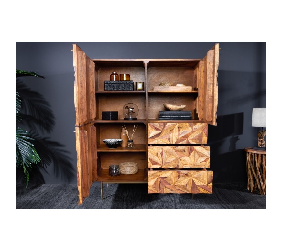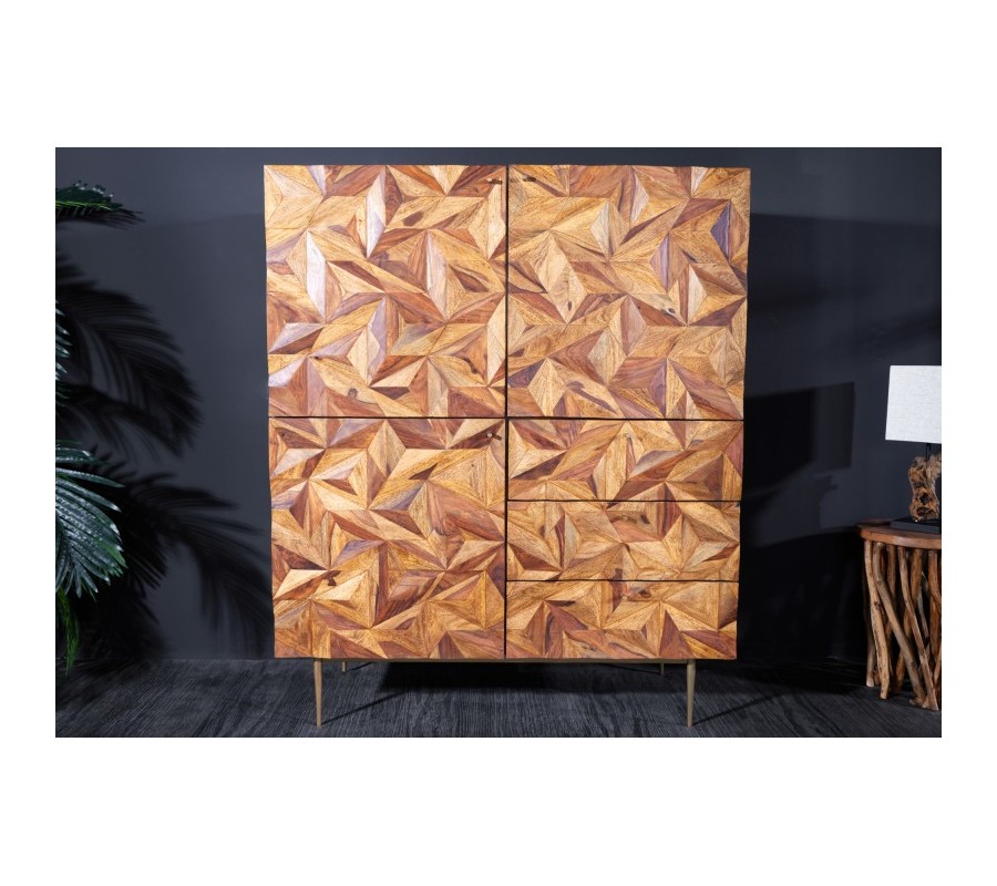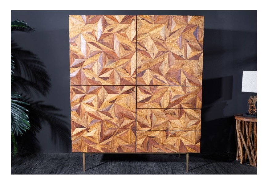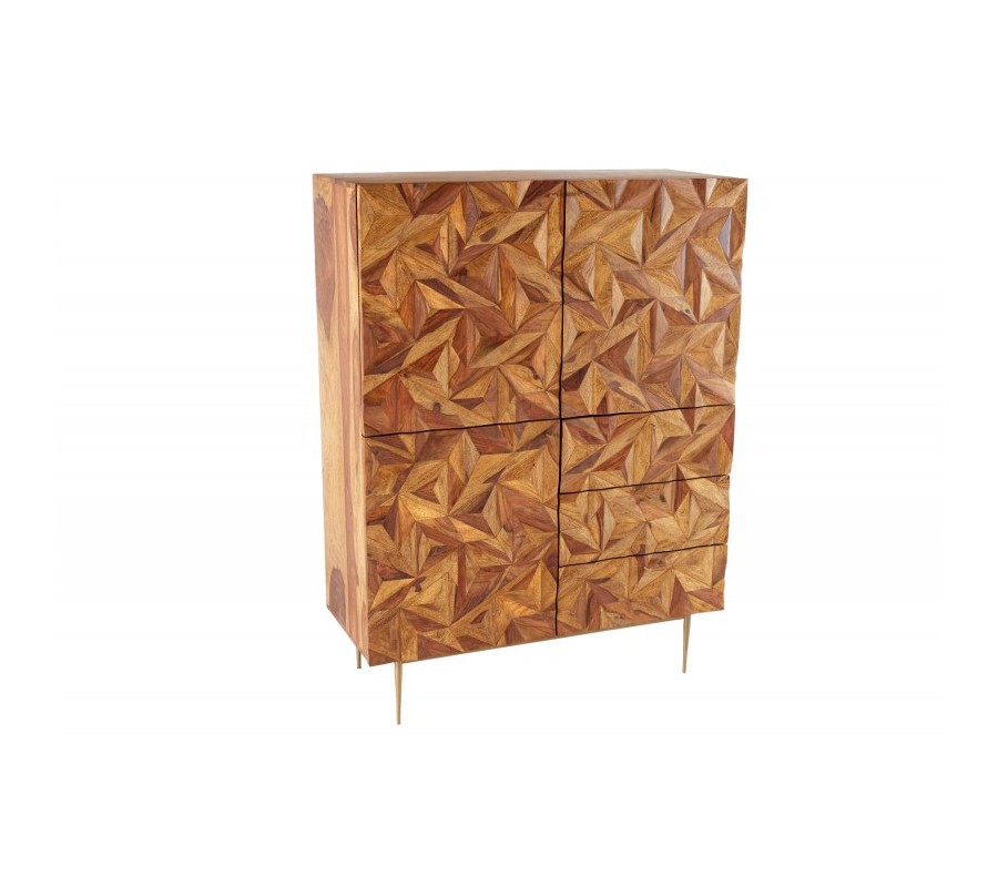 Dizajnová skrinka Sovoy predstavuje jedinečnú kombináciu kvalitných materiálov a dizajnovej farebnosti. Je vyrobená z palisandrového dreva v prírodnej hnedej farbe s pútavým 3D dizajnom. Vďaka ručnej výrobe je každý jeden kúsok jedinečným umeleckým dielom a v dizajne sa tak môžu objavovať drobné odhýlky v štruktúre či farbe. Efektný dizajn je tvorený umiestňovaním jednotlivých geometrických kúskov dreva v rôznych odtieňoch vedľa seba. Krásna kresba palisandrového dreva zdobí povrch a dodáva mu elegantný naturálny vzhľad. Art deco vzhľad skrinky je umocnený elegantnými kovovými nožičkami zlatej farby. Skrinka Sovoy okrem pútavého dizajnu ponúka bohatý úložný priestor v podobe poličiek a zásuviek, ktorý možno všestranne využiť pri umiestnení v obývačke, spálni i pracovni. Pre dokonalú zladenie vašich priestorov odporúčame kombináciu aj s ďalšími rovnomnnými kúskami, dekoráciami v art deco štýle so zlatými akcentami a doplnkami z kovu.