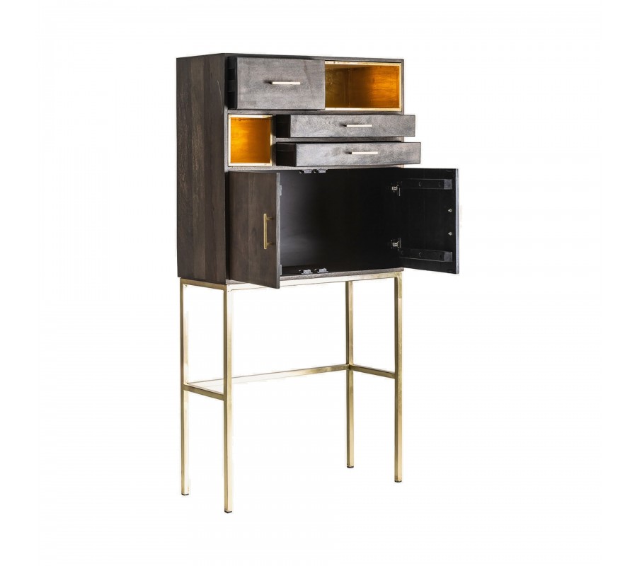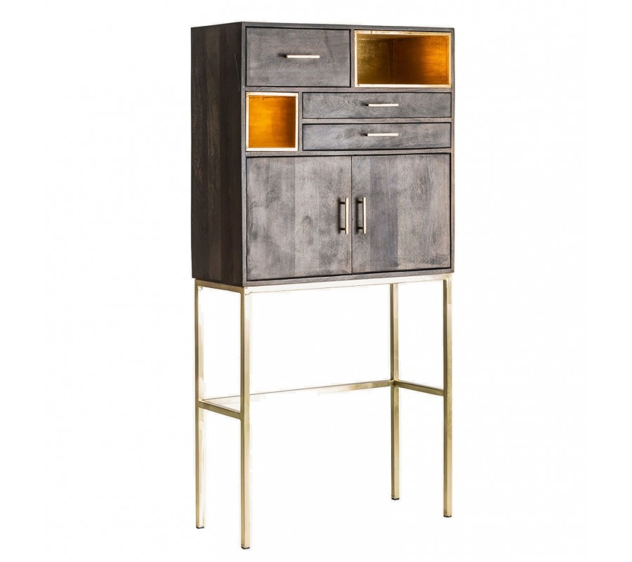 Barovú skrinku môžete skombinovať s ďalším nábytkom v art deco štýle. V jedálni sa skvele prepojí so stoličkami či jedálenským stolom so zlatými kovovými nožičkami. V obývačke môžete pridať sedačku so zamatovým alebo buklé čalúnením, čím zdôrazníte luxusný charakter miestnosti. Mangové drevo pôsobí príjemným a teplým naturálnym dojmom a hodí sa tiež do priestorov zariadených v prírodných svetlých odtieňoch, kde zažiari zlatý kovový akcent.