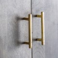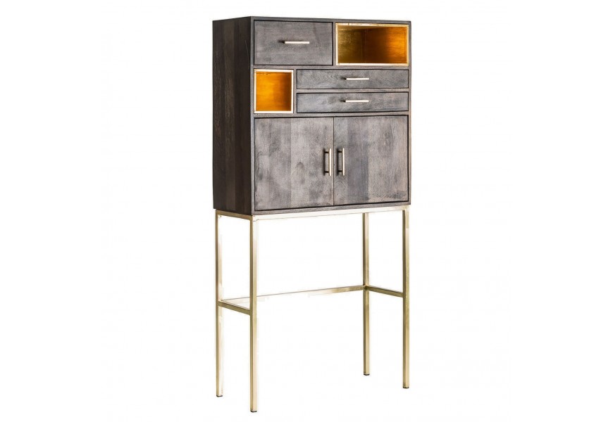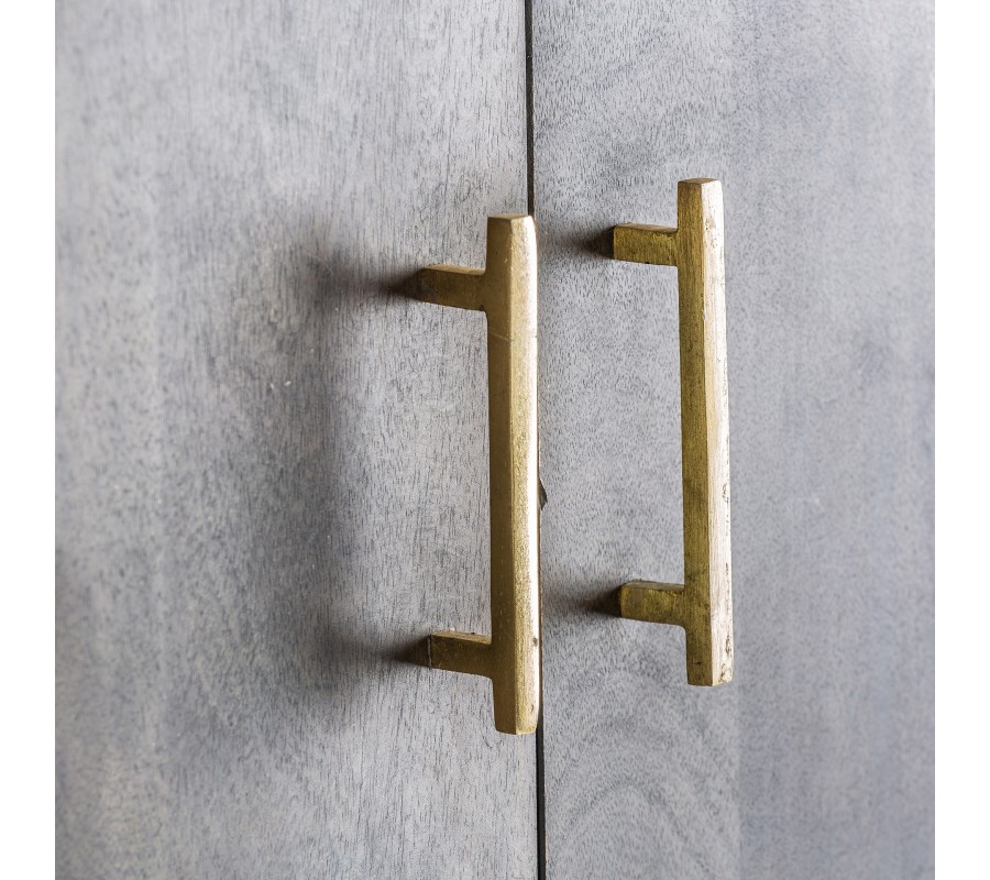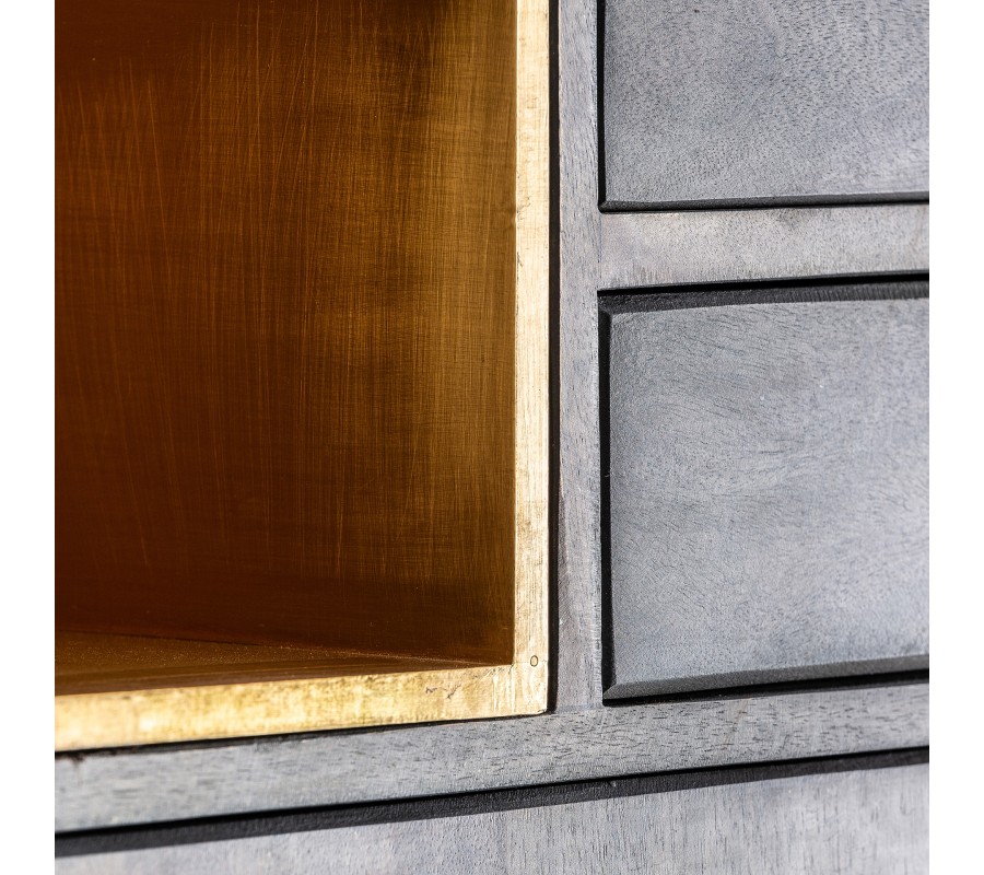 Z rovnakého materiálu ako nohy, sú tiež zhotovené jednoduché hranaté úchytky a vnútorné steny otvorených políc. Kombinácia žiarivej metalickej zlatej farby vytvára príjemný kontrast s prírodnými čokoládovo hnedými odtieňmi mangového dreva.