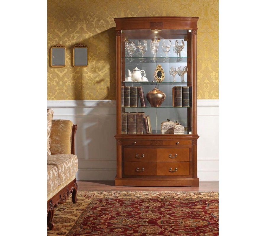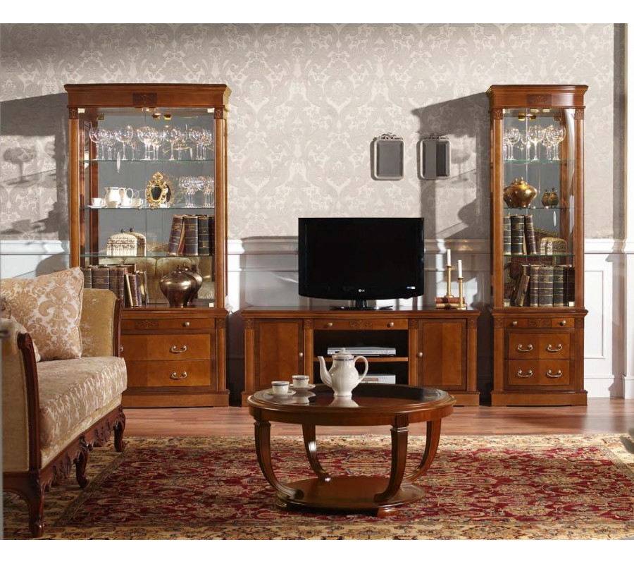Luxusná obývacia zostava Castilla je klenotom klasických historických interiérov. V zostave nájdete presklené rustikálne vitríny so zásuvkami, klasický intarzovaný TV stolík, či ručne vyrezávaný konferenčný stolík a elegantnú pohovku. Luxusná bývacia stena Castilla je vyrobená z masívneho dreva, ktoré je obohatené intarziou a vyrezávanými detailami. Môžete si vybrať z dvoch farebných prevedení - orech, čerešňa. Všetky kúsky v obývacej zostave Castilla sú bez nožičiek vďaka čomu zostáva pôsobí robustnejším, rustikálnym charakterom. Kontrastne jemným dojmom posobia presklené vitríny s elegantným LED podsvietením a vintage kovové úchytky v zlatej farbe typické pre celú obývaciu zostavu Castilla. Pre vyniknutie historizujúceho starožitného štýlu odporúčame obývačku zariadenú nábytkom Castilla doplniť ďalšími rustikálnymi detailmi ako napríklad dobovým obkladom na stenu či kvalitnou tapetou vo svetlých farbách s jemným ornamentálnym vzorom, ktorý dizajnovo prepojí jemne červenkastý nádych nábytku Castilla.