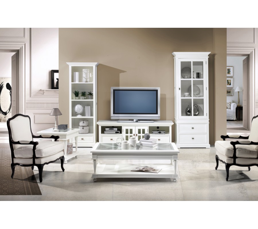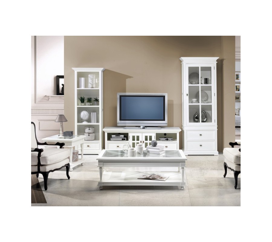 Luxusná biela rustikálna obývacia zostava Belliene z masívu s čistými líniami v bielej farbe a ozdobným vyrezávaním