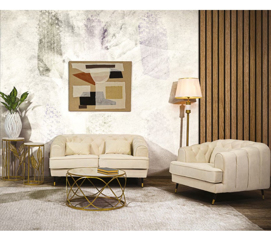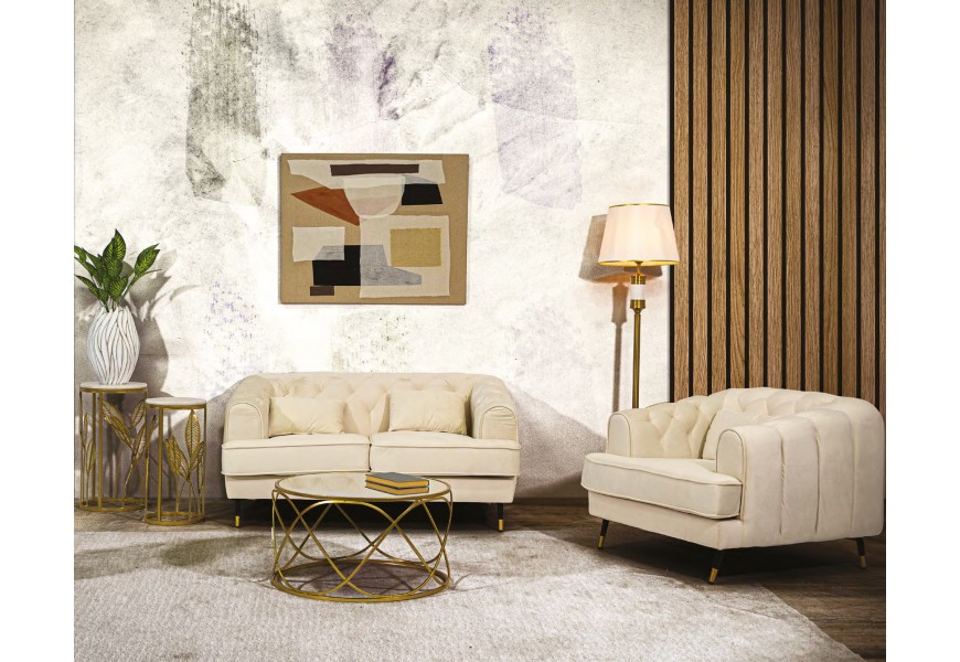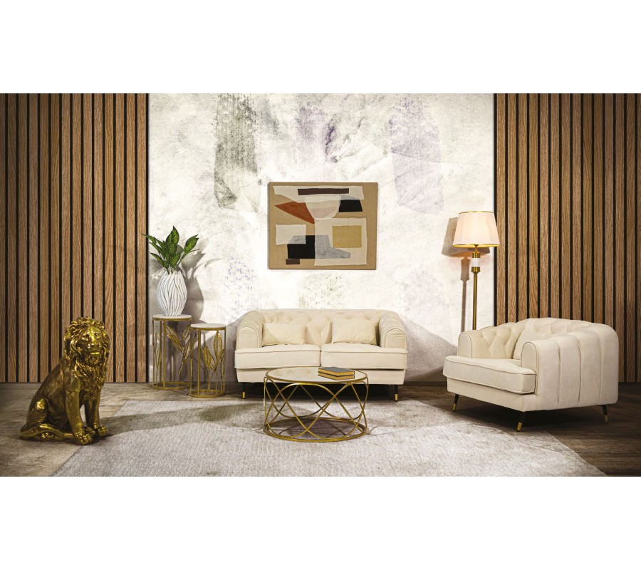 Zostava nábytku Lana prinesie do vašej obývačky eleganciu art deco štýlu a pocit luxusu. Sofistikovanú krémovú farbu výborne dopĺňajú zlaté akcenty, ktoré v kombinácii s mramorom a zrkadlový sklom zdôrazňujú honosný glamour vizuál.