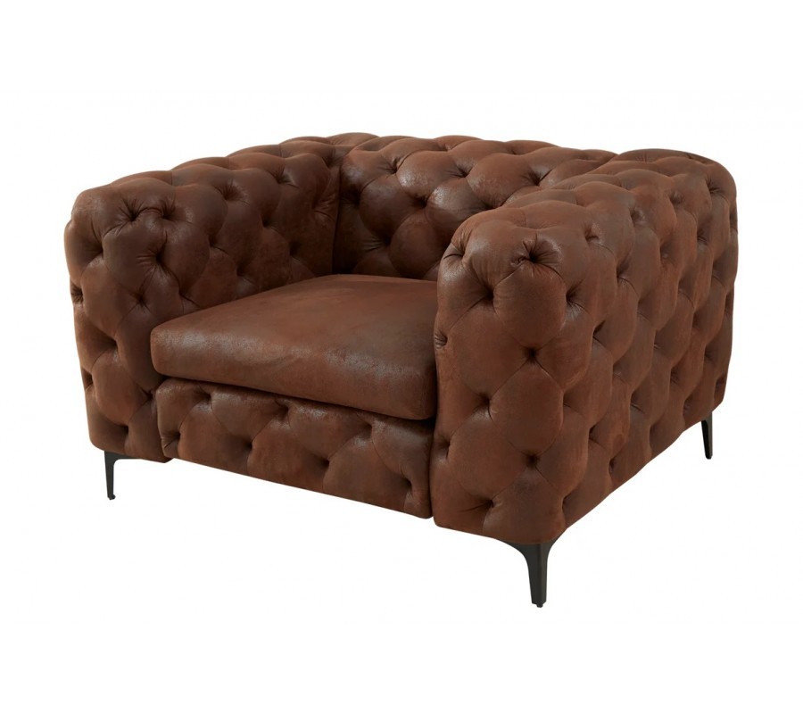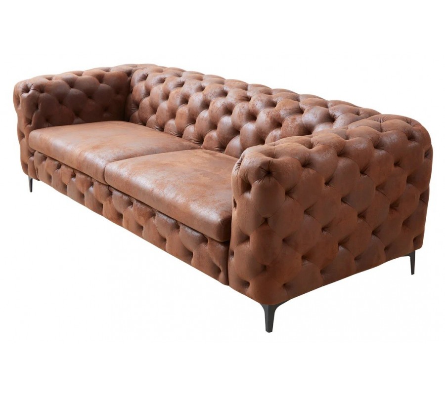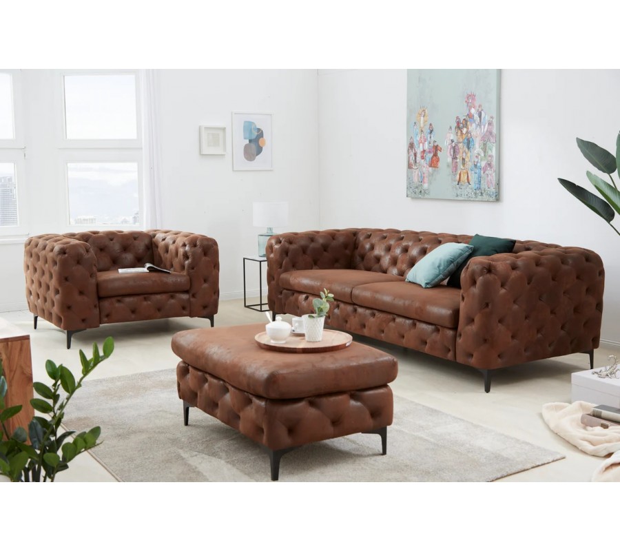 Nábytok je čalúnený a potiahnutý ekokožou v nádhernom teplom koňakovo hnedom odtieni. Materiál je príjemný na dotyk a zároveň nenáročný na údržbu. Jemná dizajnová patina výborne korešponduje s hlbokým bodovým prešívaním v chesterfield štýle, ktoré vytvára kosoštvorcový vzor a prináša do moderného dizajnu dotyk luxusu. Jednoduché kovové nožičky nábytok vizuálne odľahčujú a zároveň zabezpečujú výbornú stabilitu.