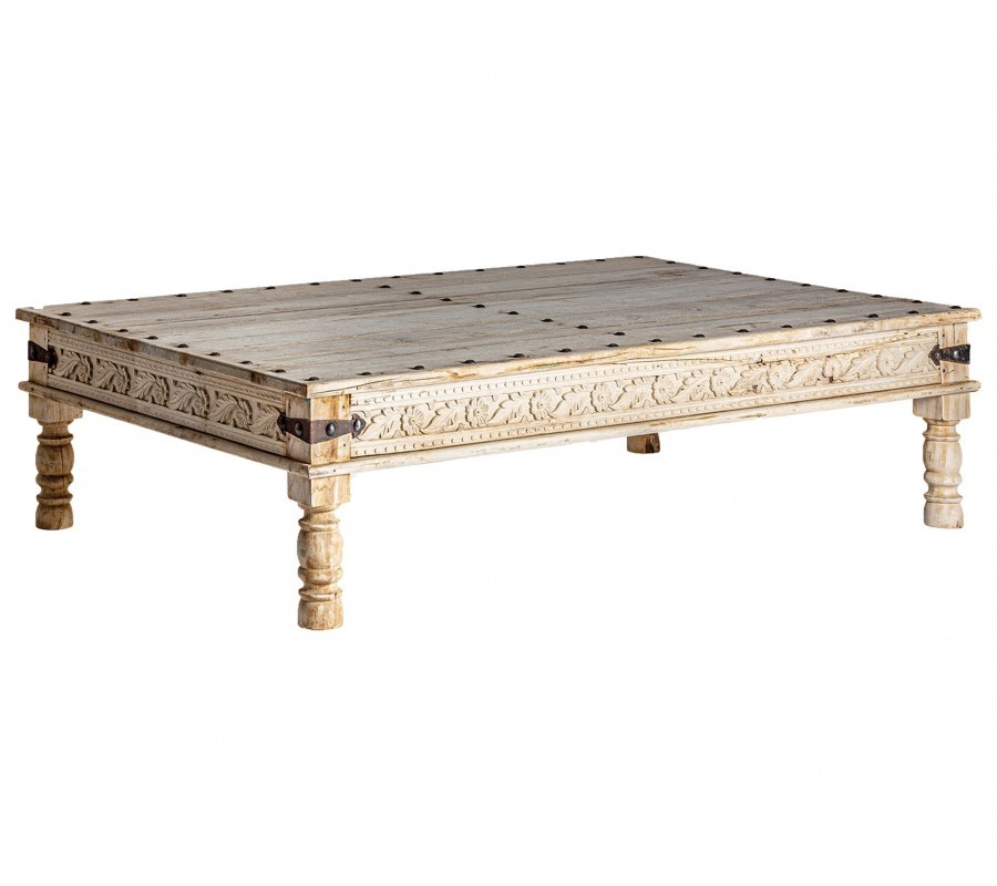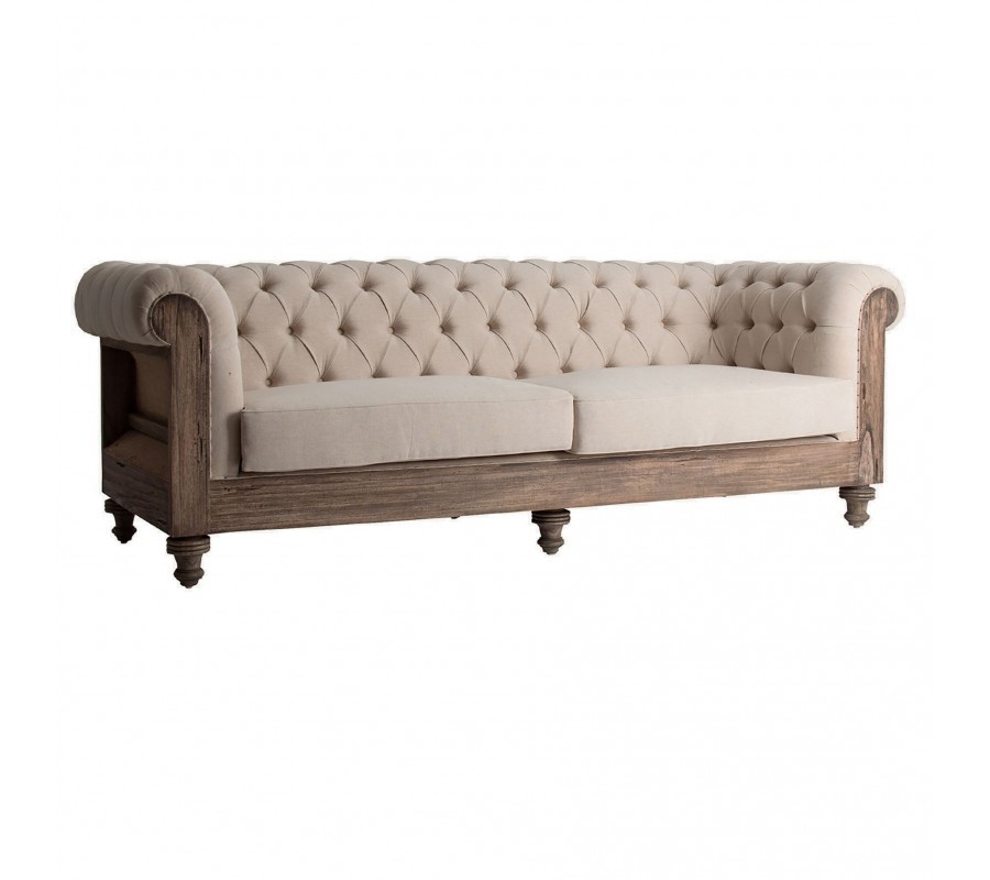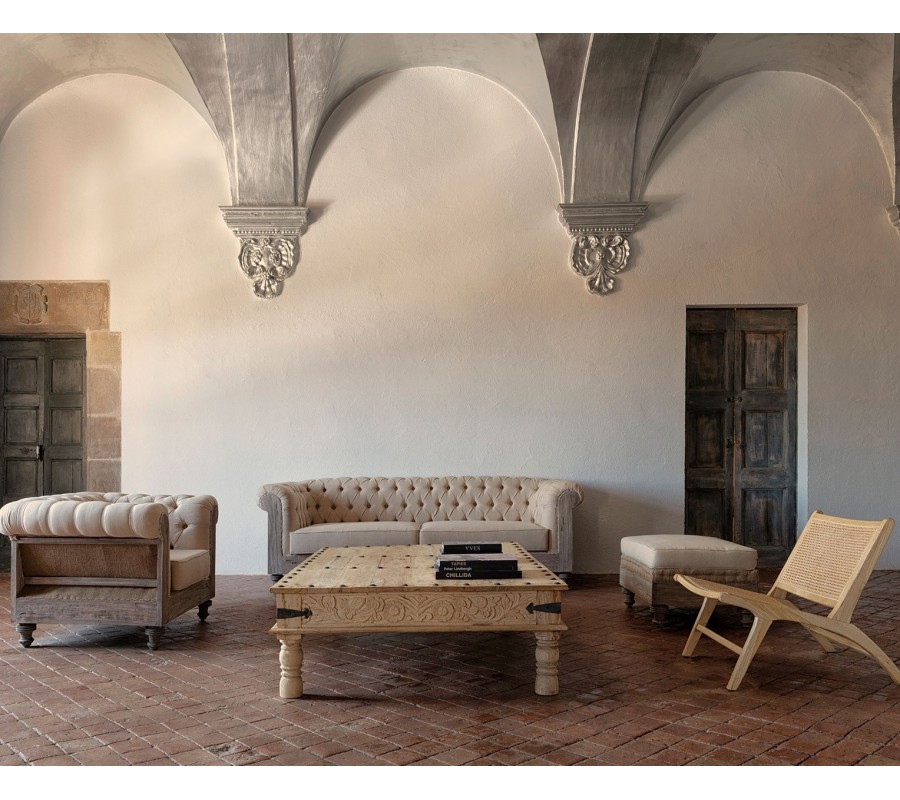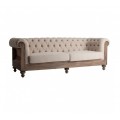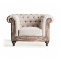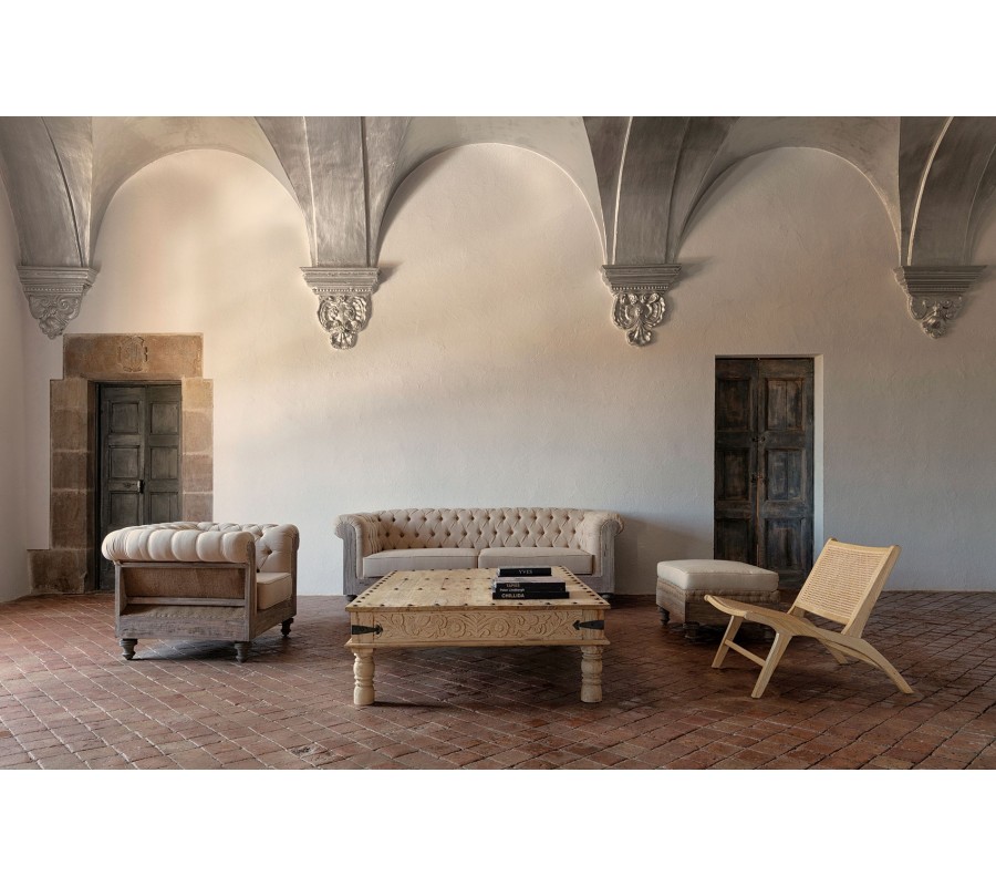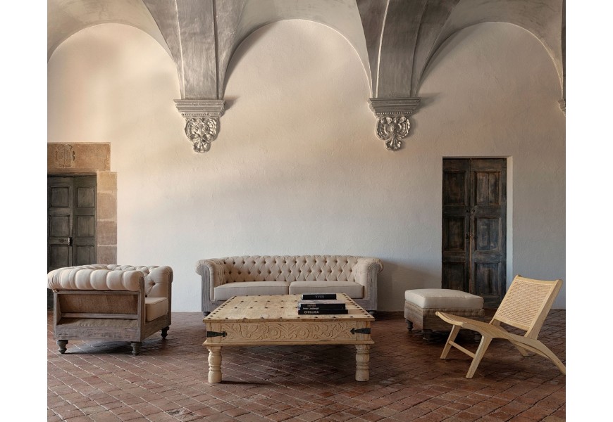Sedenie pre ďalšie štyri osoby zabezpečí set čalúneného kresla a sedačky s luxusným chesterfield prešívaním. Kontrastne ho dopĺňa drevená konštrukcia so starožitným efektom vymytej farby a bohato vyrezávané nožičky. Mohutná silueta, mäkké penové čalúnenie a na dotyk príjemný poťah v svetlej krémovej farbe zaručia maximálny komfort.