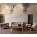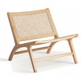 V centre zostavy sa nachádza konferenčný stolík z masívneho dreva v naturálnej svetlej hnedej farbe. Na prvý pohľad upúta svojím bohatým ornamentálnym zdobením. Florálne motívy pôsobia elegantným dojmom a prinesú do priestoru dotyk vidieckej estetiky. Stolík výborne dopĺňa drevené kreslo s ratanovým výpletom v rovnakom farebnom tóne. Zaujímavým detailom je sofistikovaný viedenský výplet na opierke a sedadle.