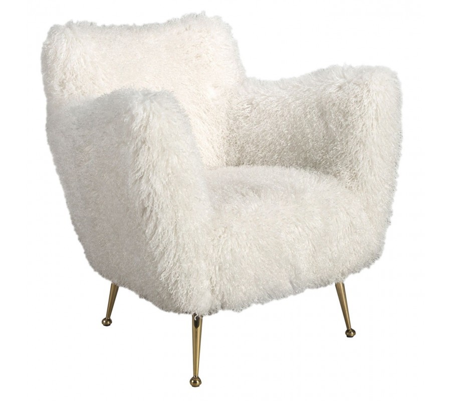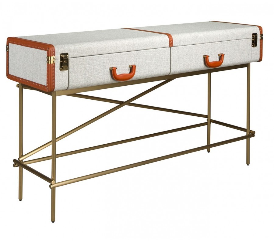 S tónmi poťahu výborne korešpondujú konzolový stolík a barová skrinka. Sivé textilné čalúnenie dopĺňajú detaily z pravej kože v koňakovo hnedom odtieni, ktoré zároveň dodávajú nábytku vzhľad vintage cestovných kufrov. Bohatý dizajn štýlovo kontrastuje s modernou sedačkou, no zároveň pôsobí vďaka elegantným zemitým farbám harmonicky. Zlaté kovové podstavy a zaoblené hrany úložných priestorov prinášajú do priestoru nádych art deco estetiky. V rovnakom zlatom prevedení sú vyrobené aj nožičky kresla s bielym kožušinovým poťahom. Kompozícii dodáva dotyk glamourovej extravagancie a najvýraznejšiu štruktúru.