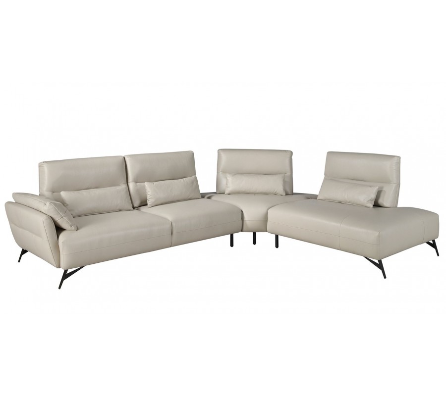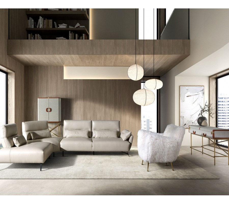 V centre zostavy sa nachádza mohutná rohová sedačka. Poskytne miesto na sedenie pre 4 až 5 osôb, no aj napriek svojej veľkosti priestor vizuálne nezaťaží. Originálny dizajn voľne stojacich opierok a štíhle nožičky, v kombinácii so svetlou sivou farbou poťahu, pôsobia vzdušným dojmom. Exkluzívna pravá koža zasa podčiarkne luxusný charakter miestnosti.