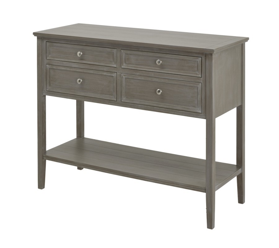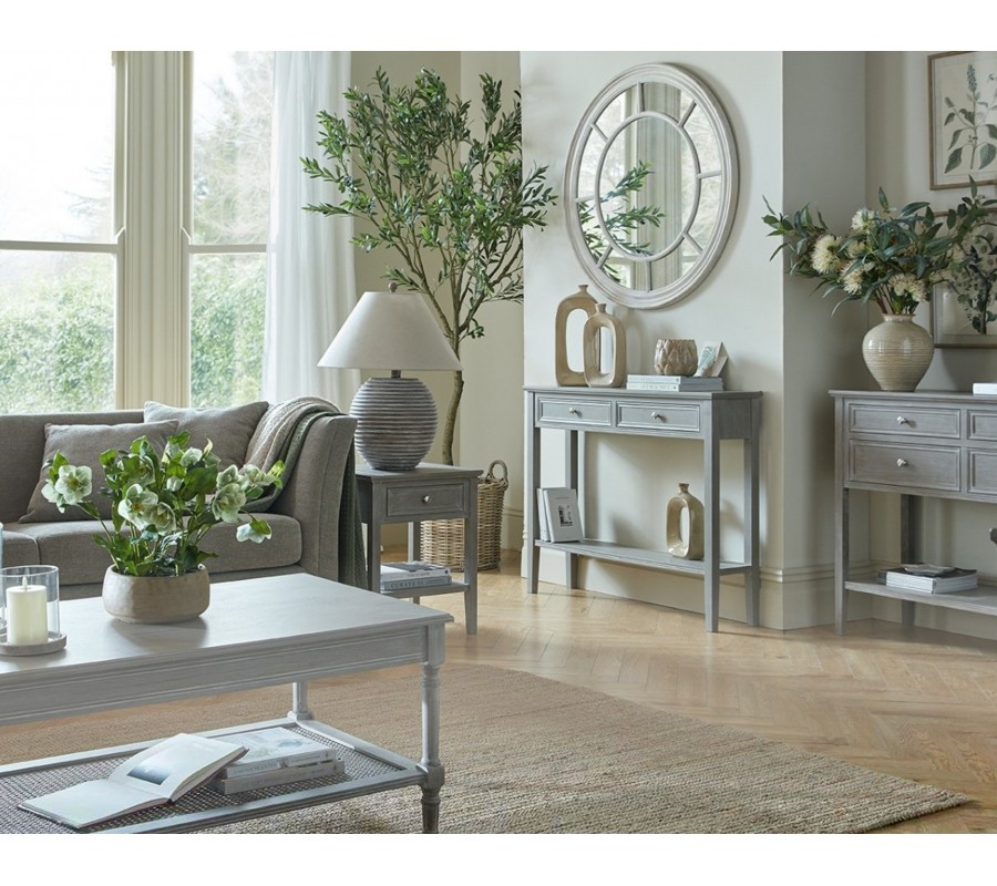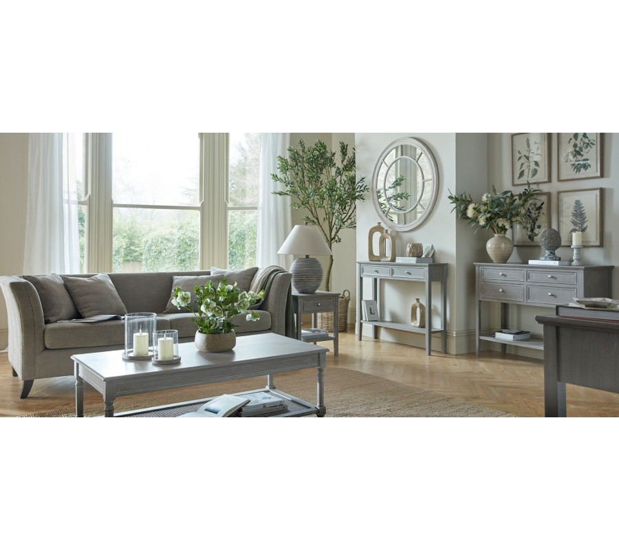 Nábytok je vyrobený z masívneho dreva v elegantnom sivom prevedení. Povrch je upravený jemnou patinou, ktorá mu dodáva štýlový vintage nádych. Lakovanie celú zostavu zjednocuje, zatiaľ čo odlišný dizajn konferenčného stolíka dodá miestnosti hravý eklektický prvok.