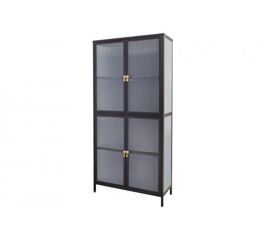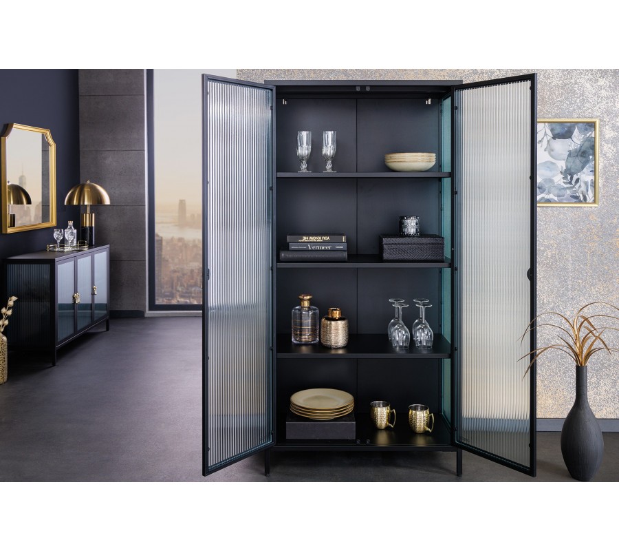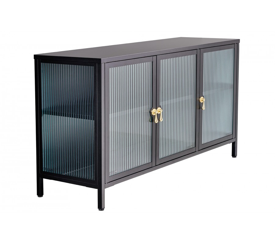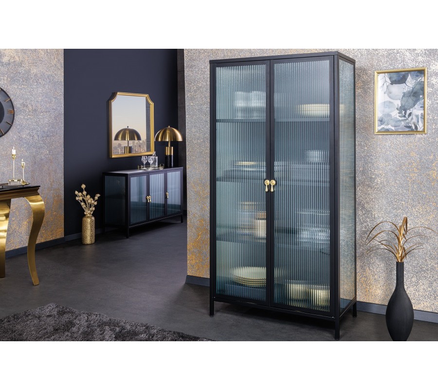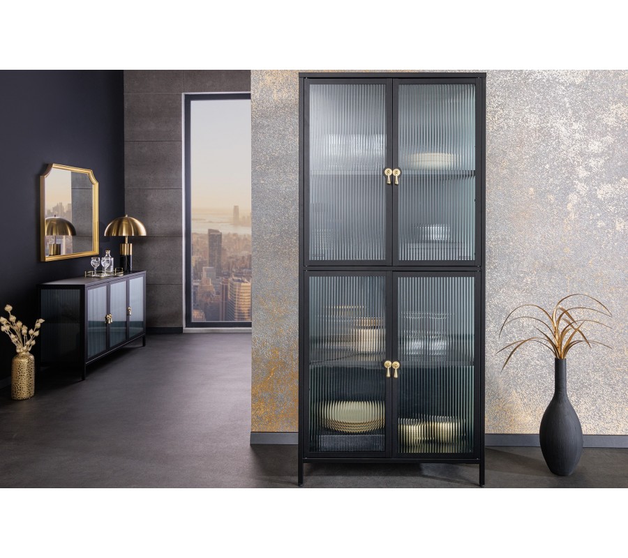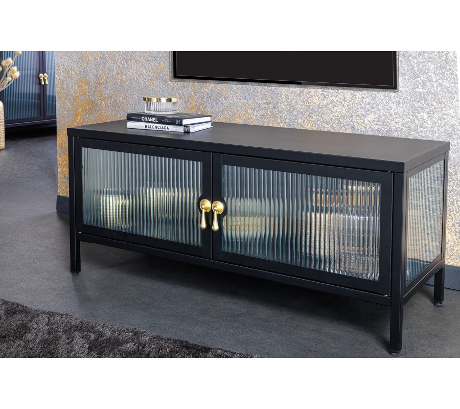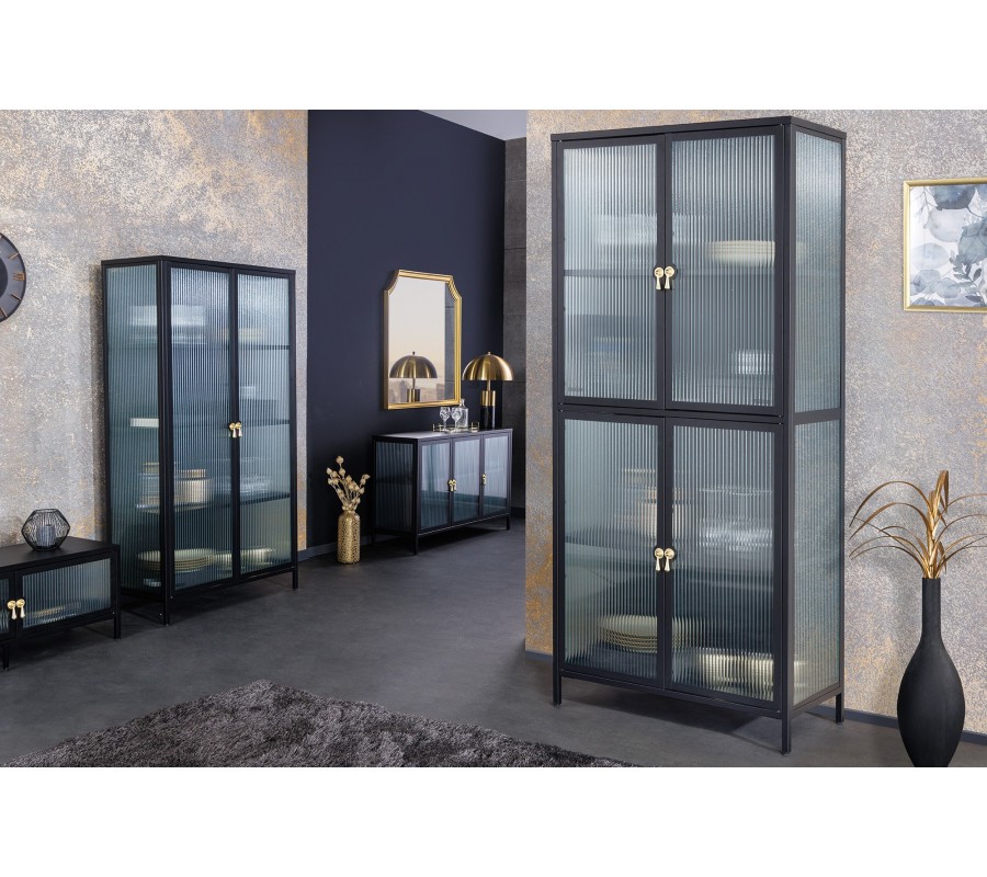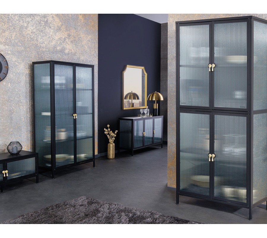 Moderná industriálna čierna obývacia zostava Industria Durante s rebrovaným priehľadným sklom a úchytkami v zlatej farby
