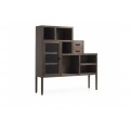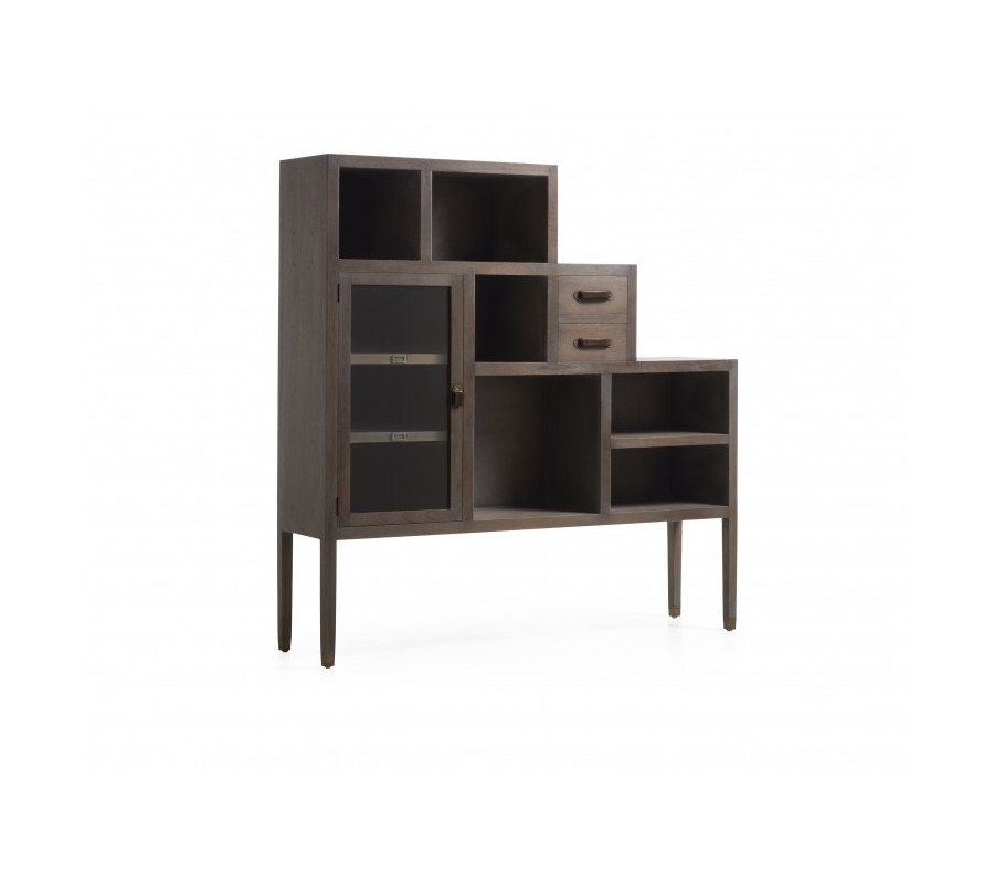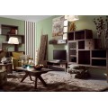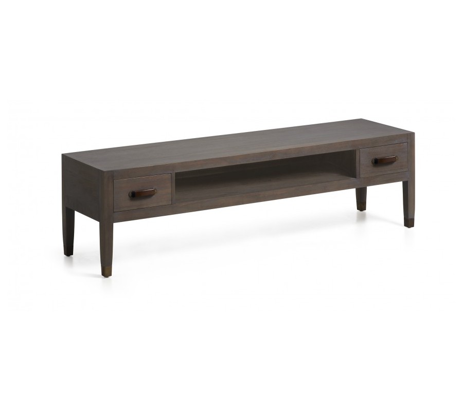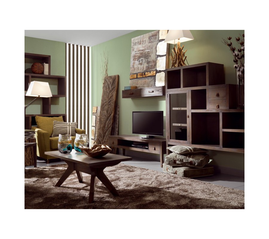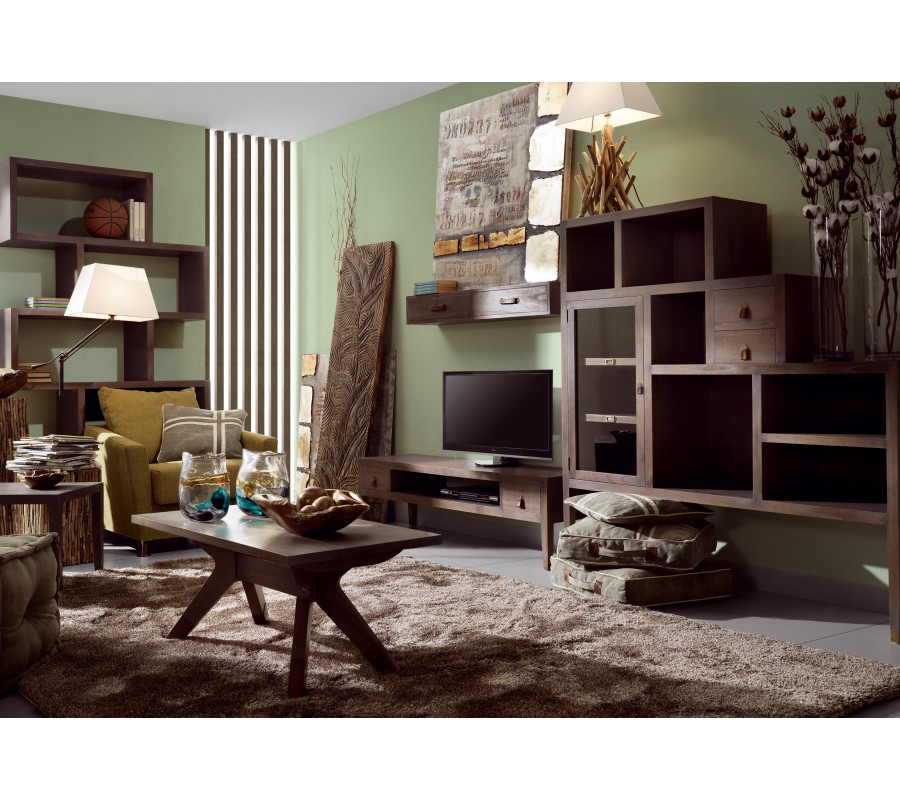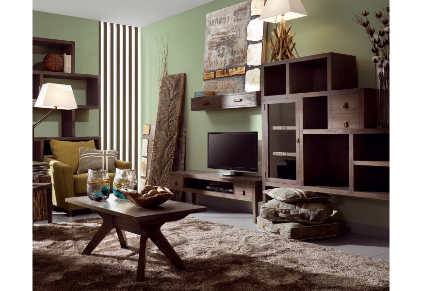 Luxusná obývačka v koloniálnom štýle z kolekcie nábytku SPARTAN je vyrobená z masívneho dreva MINDI, hnedo-modro-čierneho výrazu, podobného drevu WENGE. Štýl kolekcie odrzkadluje sedemdesiate roky. Tento nábytok v koloniálnom štýle má úchyty z tvrdej kože hnedej farby.