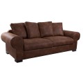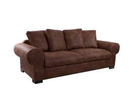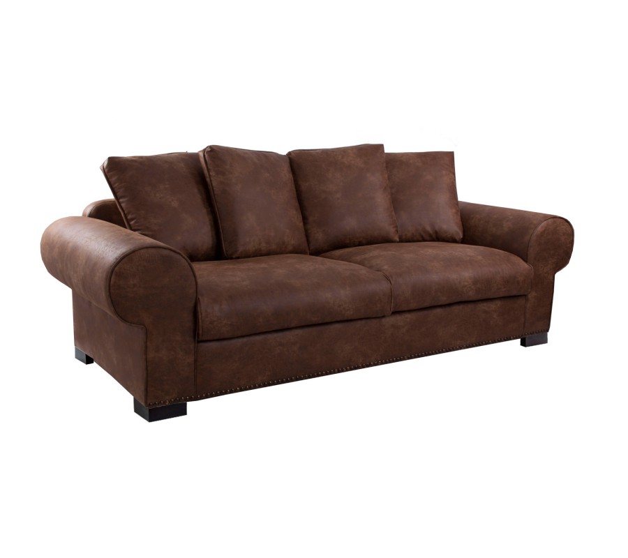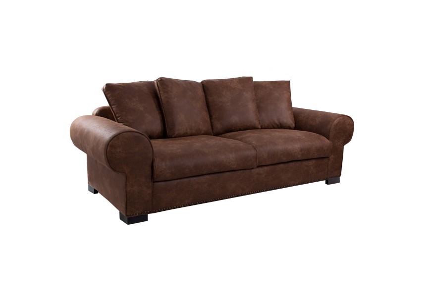 Trojmiestna sedačka hnedej farby má poťah vyrobený z polyesteru a vnútornú konštrukciu z borovicového dreva .