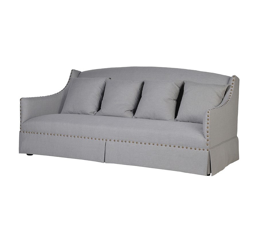Moderná čalúnená sivá trojsedačka s poťahom, zlatými ckovmi a štyrmi vankúšmi poskytuje vďaka svojím rozmerom dokonalé pohodlie pre Váš oddych i dostatok miesta pre Vašu návštevu. Na sedačku sa pohodlne usadia tri dospelé osoby, vďaka vankúšom poskytuje možnosť pohodlnejšieho sedenia i skrátenia sedu. K pohodliu prispievajú opierky na ruky, ktoré sú zdobené cvokmi. Nožičky sedačky sú prekryté elegantným sivým poťahom a vďaka svojej výške poskytujú jednoduchší prístup k upratovaniu. Sedačka Faustine je vhodná najmä do moderne zariadených interiérov, no vďaka svojej jemne sivej farbe a jemným líniám oživí akúkoľvek domácnosť.