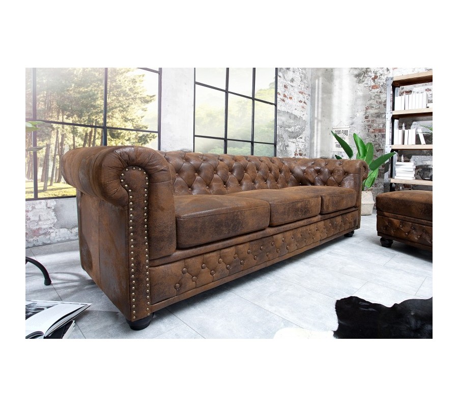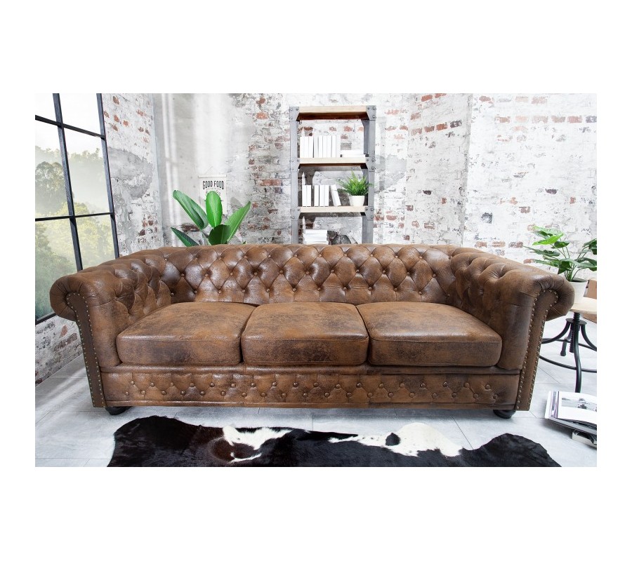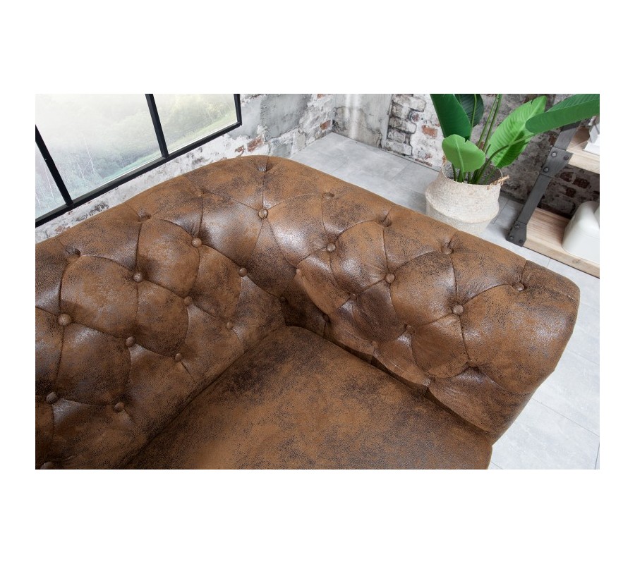 Trojmiestna sedačka Antik je pôsobivým príkladom ikonického čalúneného nábytku s vintage šarmom. Poťahová látka z ekokože má hnedý odtieň s výrazným patinovaným efektom. Povrchová úprava podčiarkuje nadčasový charakter sedačky a dodáva jej autentickosť v industriálnom štýle.