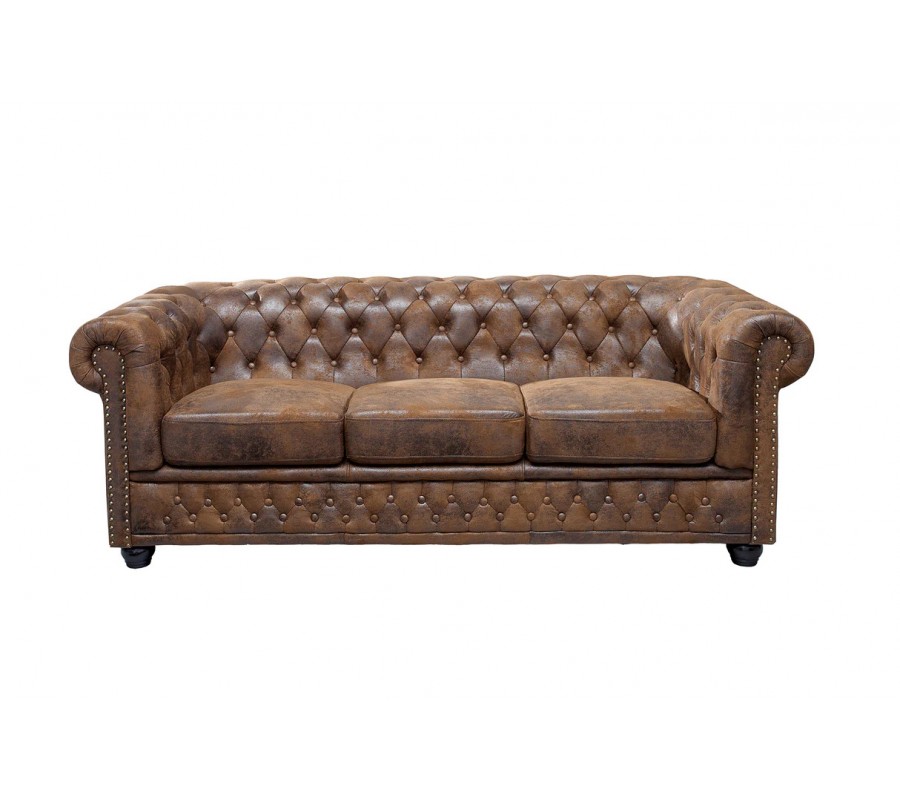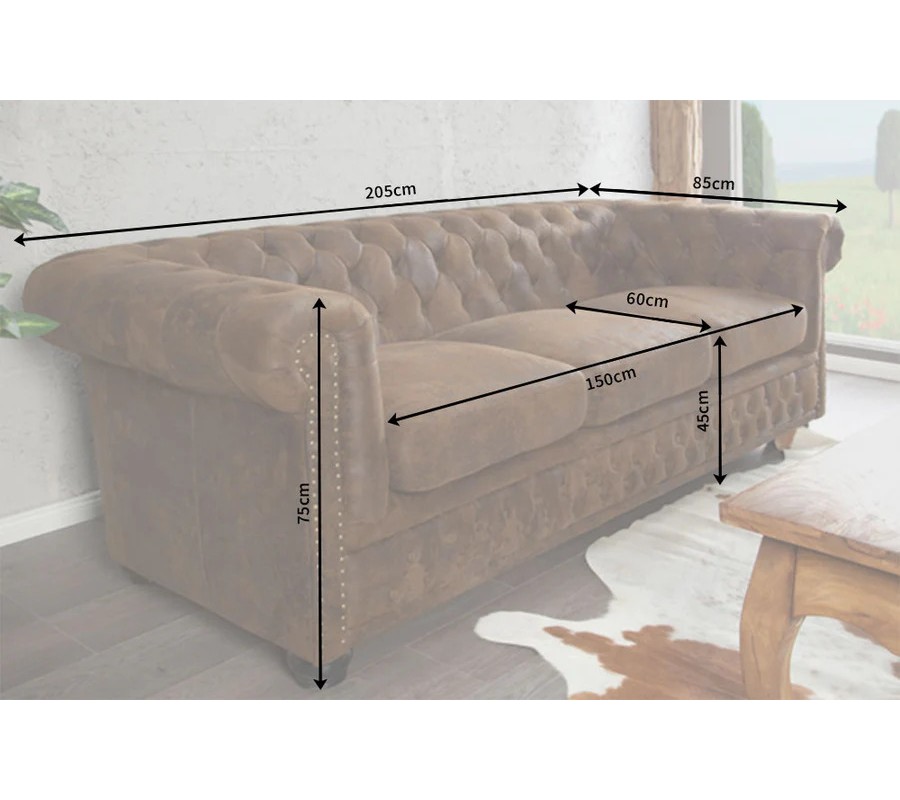 Obdĺžniková konštrukcia sedačky má charakteristické chesterfield prešívanie s diamantovým vzorom, ktoré pokrýva prednú opieraciu časť, opierky na ruky a spodnú časť, čím vytvára vizuálnu hĺbku a štýlový charakter. Sedacia časť disponuje tromi priestrannými sedákmi štvorcového tvaru, ktoré poskytujú pohodlné sedenie pre tri osoby.