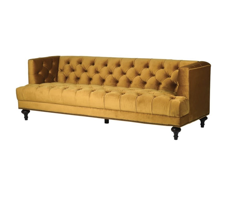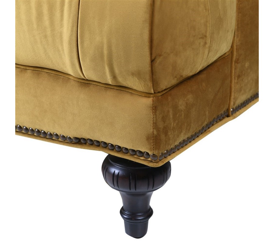 Chesterfield zamatová sedačka Nostaza v horčicovom odtieni a s drevenými dekoratívnymi nohami 213cm