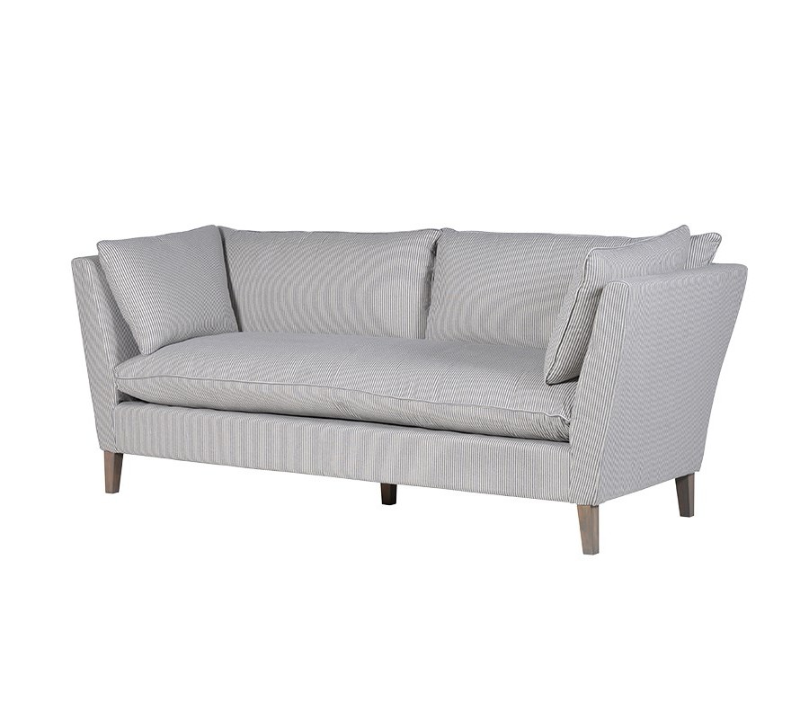 Jednoduchý nadčasový dizajn sedačky Strine je vhodný do každého klasického vidieckeho interiéru. Poťahovová látka s jemnými pásikmi modrosivej farby je doplnená prírodným vzhľadom drevených hranatých nôh. Bledý poťah s pásikmi sa skladá z kombinácie vlákien ľanu a bavlny, čím získava nenahraditeľné vlastnosti pravých prírodných materiálov. Príjemný vzhľad sedačky Strine vďaka pohodlnému mäkkému čalúneniu prináša do interiéru atmosféru domáceho komfortu a pohodlia. Čalúnené vankúše na operadle, sedadle a na područkách zabezpečujú dokonalé pohodlie počas sedu štyrom osobám. Vďaka čalúneniu na zadnej strane sedačky, je vhodné ju umiestňovať aj do priestoru. Sedačku Strine vo vidieckom štýle môžete kombinovať s romantickým nábytkom v provensálskom štýle, či vintage a viedieckym zariadením. Pohodlnú sedačku Strine skvele doplníte pridaním dekoračnych vankúšov v prírodných farbách.
