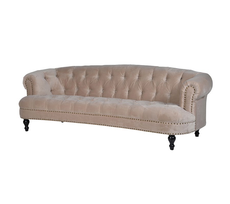 Dizajnová pohovka Juleen v Chesterfield štýle Vás oslní najmä svojím čalúnením z béžového zamatu. Dizajnovým prvkom je taktiež zdobenie v podobe svokov po celej dĺžke pohovky a vyrezávané nohy, ktoré práve Chesterfield sedačky dokonale rozjasnia a spestria. Jedinečná béžová pohovka Juleen je veľmi pohodlnýma vďačným členom domácnosti, perfektne zapadne najmä do miestností v minimalistických farebných paletách s metalickými doplnkami.