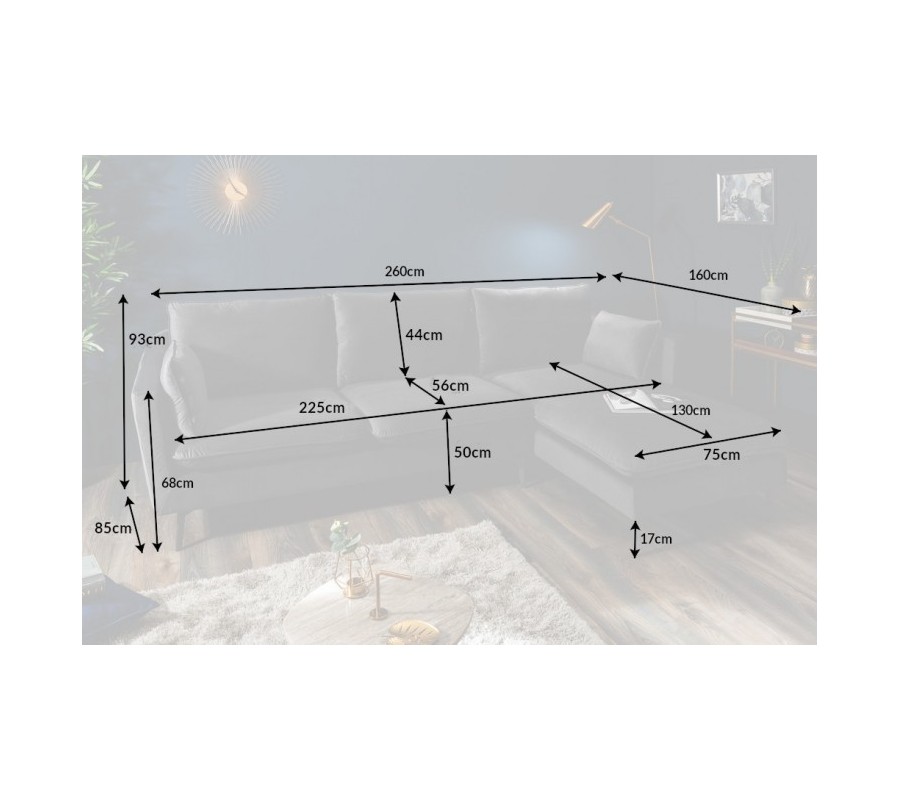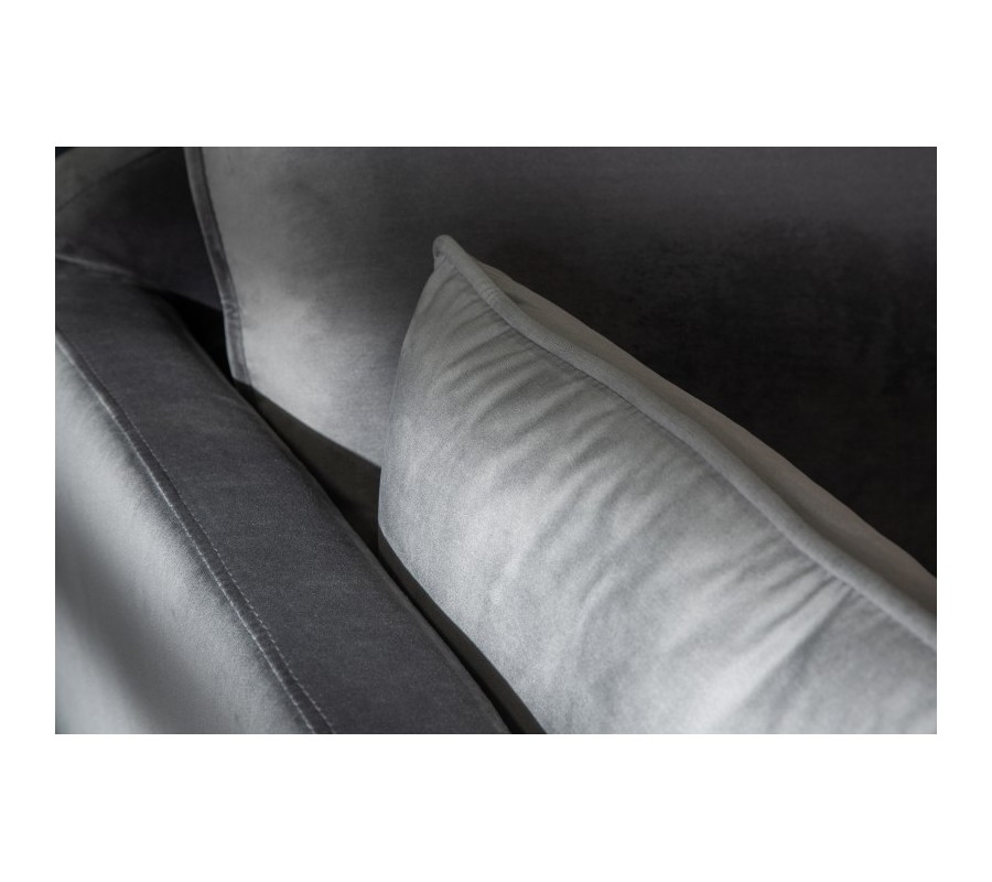 Moderný nadčasový dizajn sedačky Ribble spočíva v neutrálnom zamatovom poťahu v sivej farbe, ktorá sa opakuje na minimalistických nohách s práškovým povrchom. Vďaka vysokým nožičkám s neutrálnym povrchom je počas udržiavania čistoty priestor pod sedačkou ľahko dostupný. Sivý neutrálny odtieň je možné kombinovať s akýmikoľvek farbami, sedačku skvele doplníte pridaním dekoračných vankúšov, mäkkého koberca či hrubých závesov. Sedačka má obľúbený tvar písmena L, ktorý pozostáva z dvojsedu a otomanu. Celkový rozmer sedačky je dostačujúci na pohodlné usadenie štyroch až piatich osôb. Príjemné sedenie spestria dva vankúše v rozmeroch 55cm x 35cm. Pravý bočný otoman sedačky má rozmery sedacej časti 75cm x 130cm