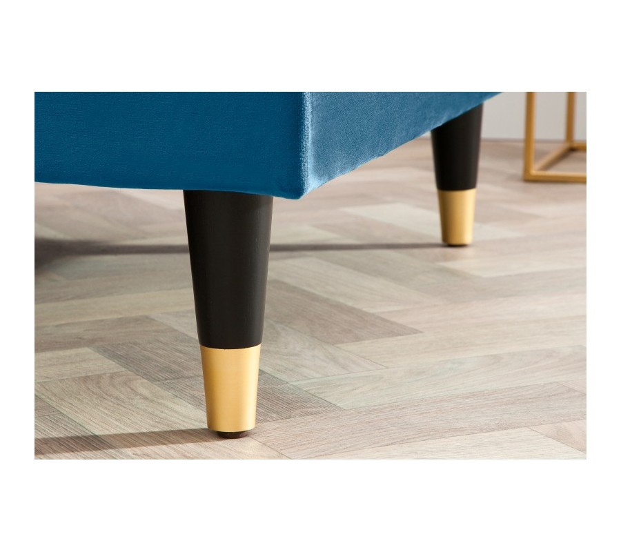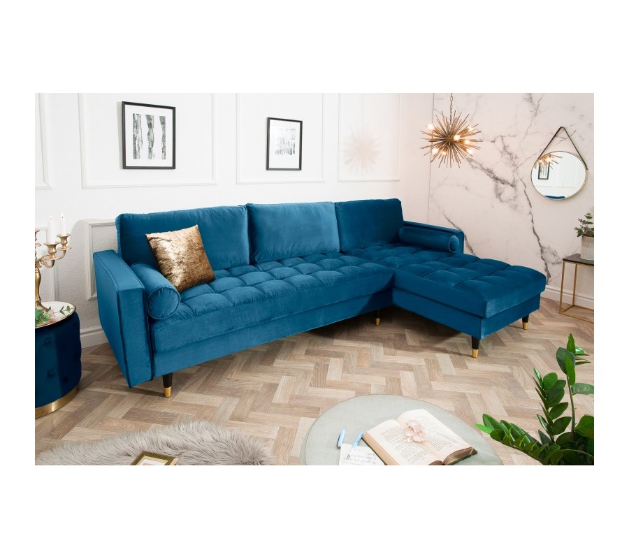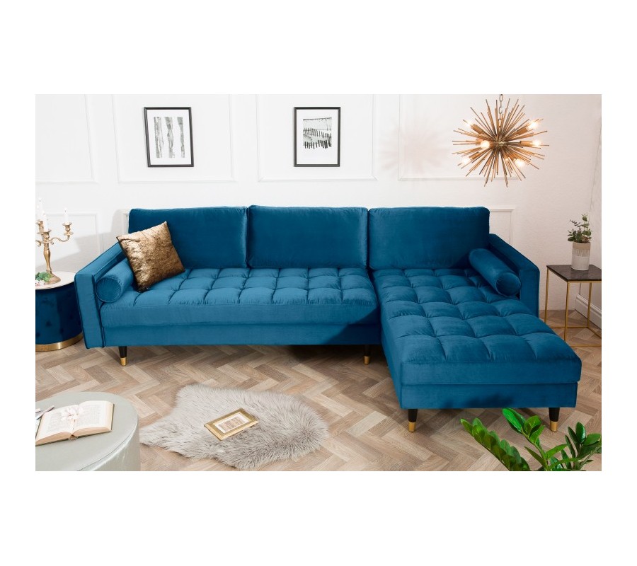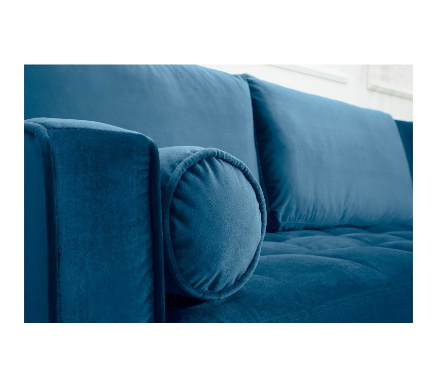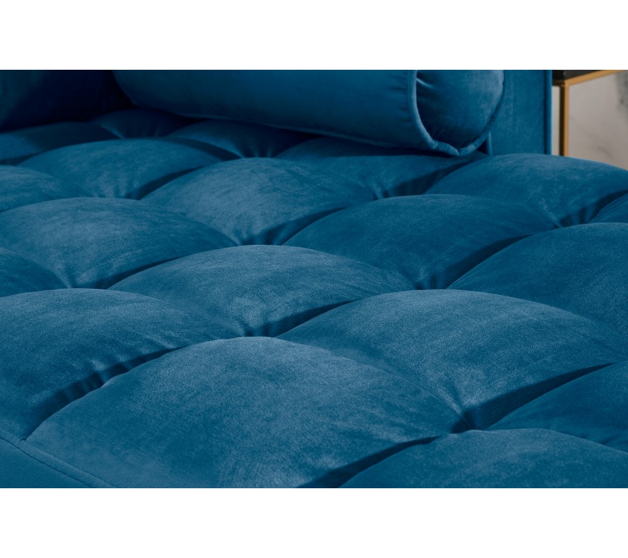 Moderná sedačka v tmavomodrej farbe a s čalúnením pripomínajúcim zamat pôsobí luxusným dojmom. Zaujímavé farebné prevedenie elegantne oživí svetlý priestor, no zapadne aj v tmavších tónoch. Avšak vynikne a upúta pozornosť v akomkoľvek interiéri. Hodí sa najmä do moderných priestorov. Zamatový poťah s výplňou z pružinového jadra je doplnený výrazným prešívaním, ktoré prispieva ku komfortu počas sedu. Praktický otoman je možné umiestniť na obe strany a sedačku tak umiestniť do ľavého alebo pravého rohu miestnosti.