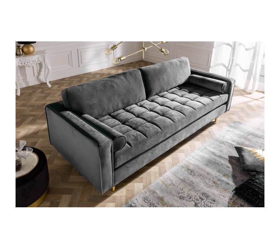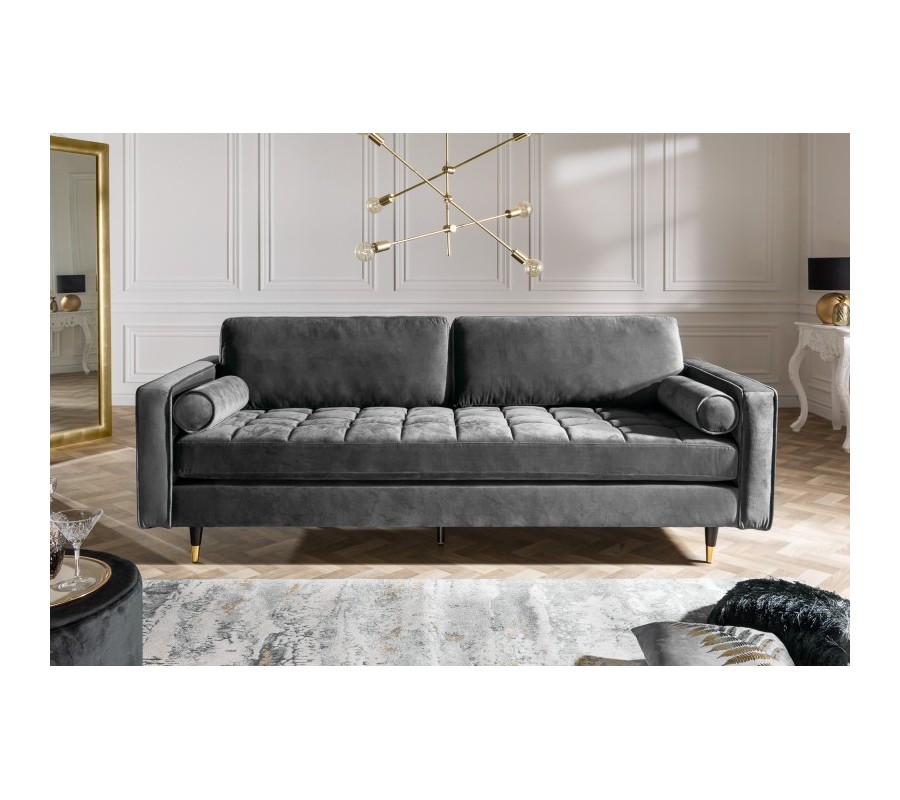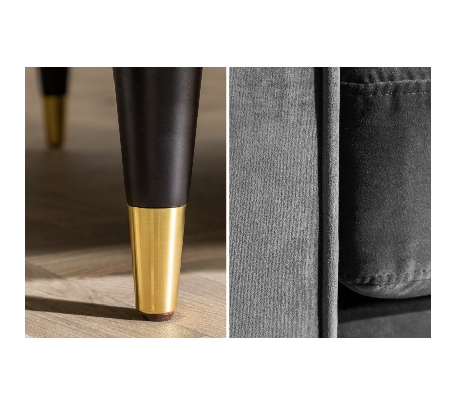Dizajnová sedačka Nefertiti predstavuje skvelý kúsok pre každého milovníka luxusu a art-deco štýlu. Zaujímavá je aj svojou nadčasovou a univerzálnou sivou farbou, ktorá je ľahko kombinovateľná a vďaka nej sedačka zapadne naozaj kamkoľvek. Zároveň vášmu interiéru dodá dizajnový nádych a šmrnc. Zamatový poťah pôsobí luxusne a postará sa o váš dokonalý komfort. Nožičky sú vyrobené z masívneho dreva, jemný zlatý prvok dolaďuje celý dizajn. Sedačka Nefertiti skvelo vynikne v kombinácii so zlatou a čiernou farbou a ideálne sa hodí do svetlejšie ladených priestorov, v rámci ktorých je možné ju umiestniť i ďalej od steny, nakoľko disponuje čalúnením i na zadnej strane.