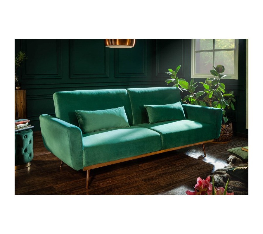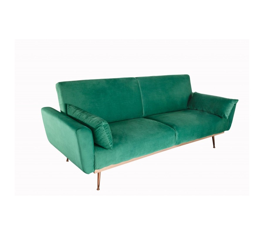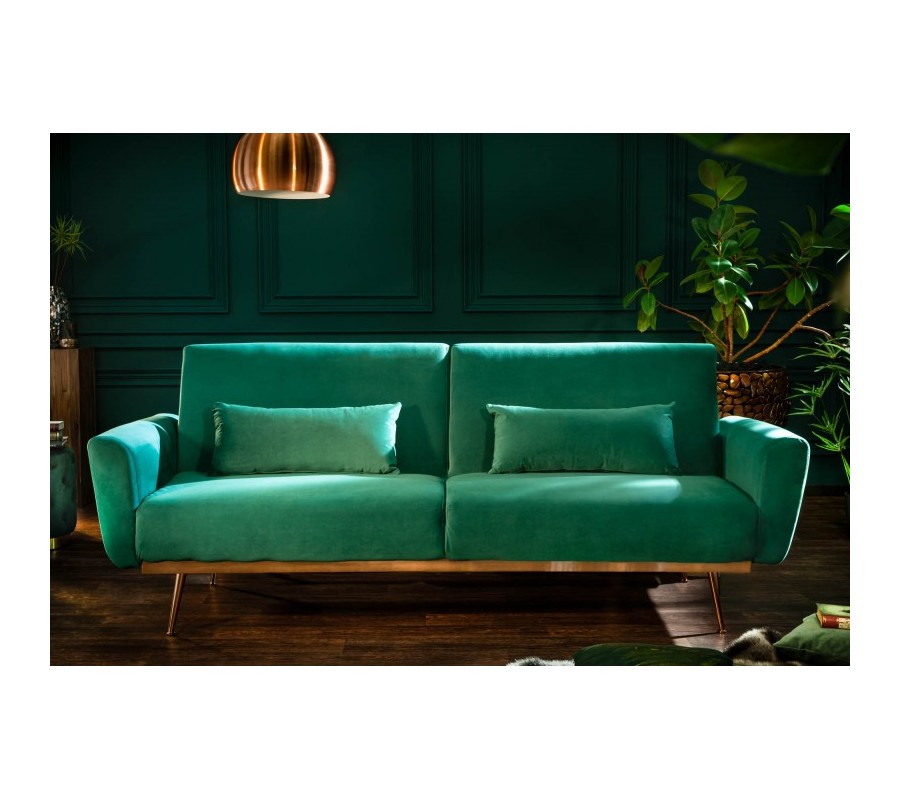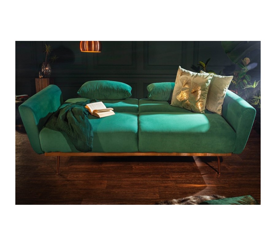 Retro rozkladacia sedačka Balea II v zelenom zamatovom poťahu s medenými nohami 208cm