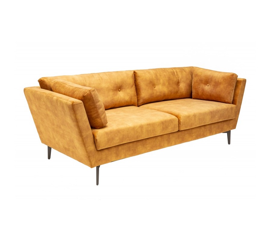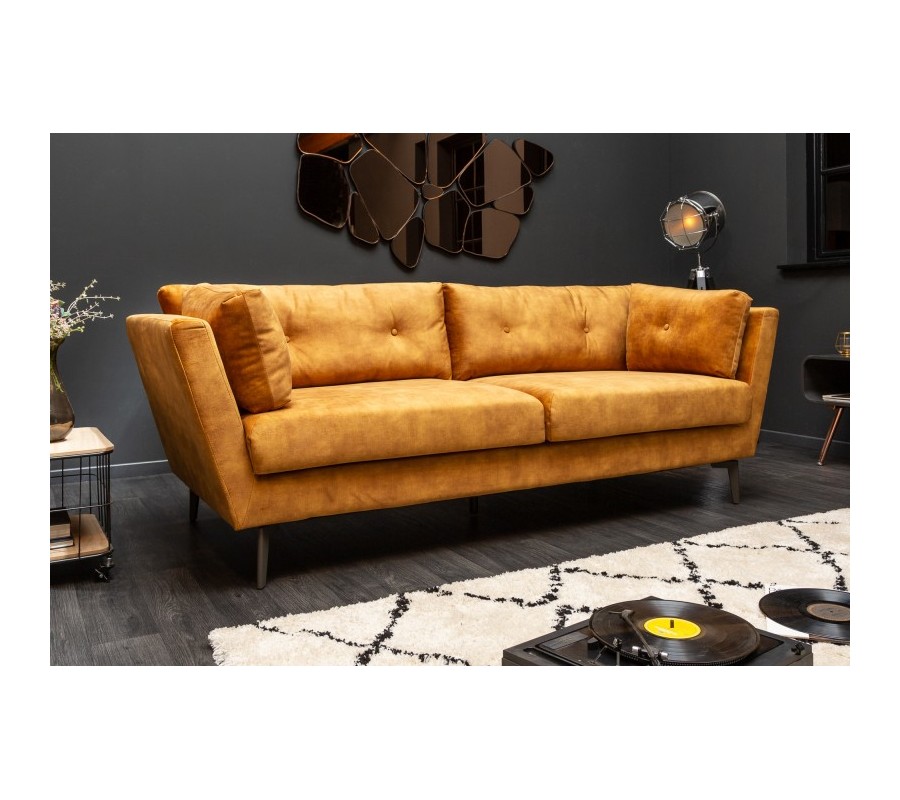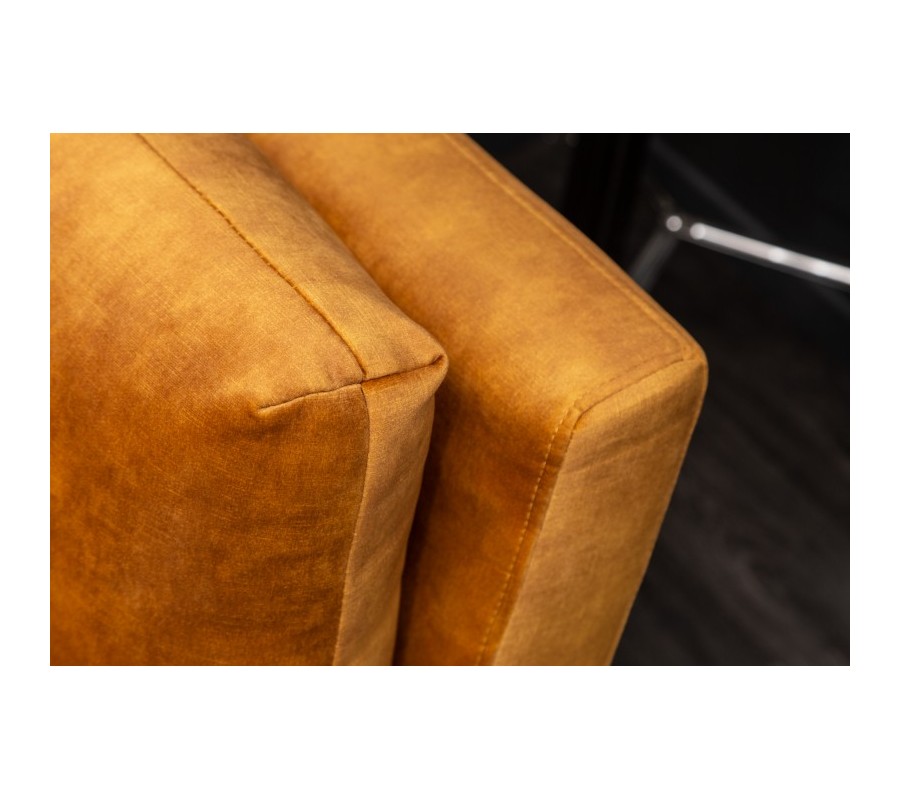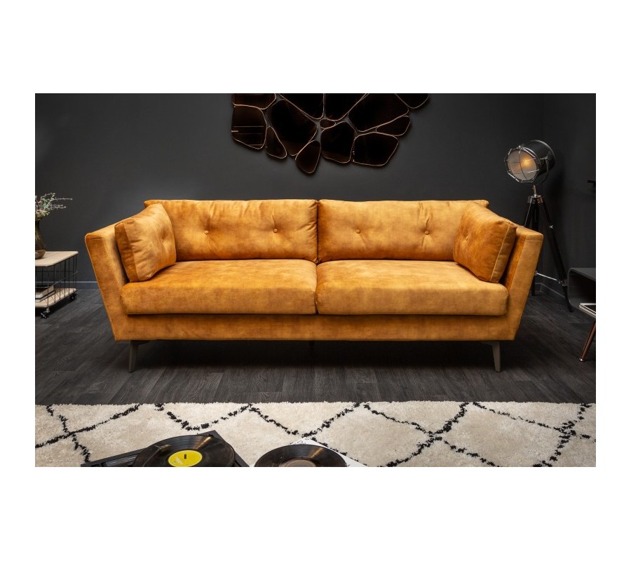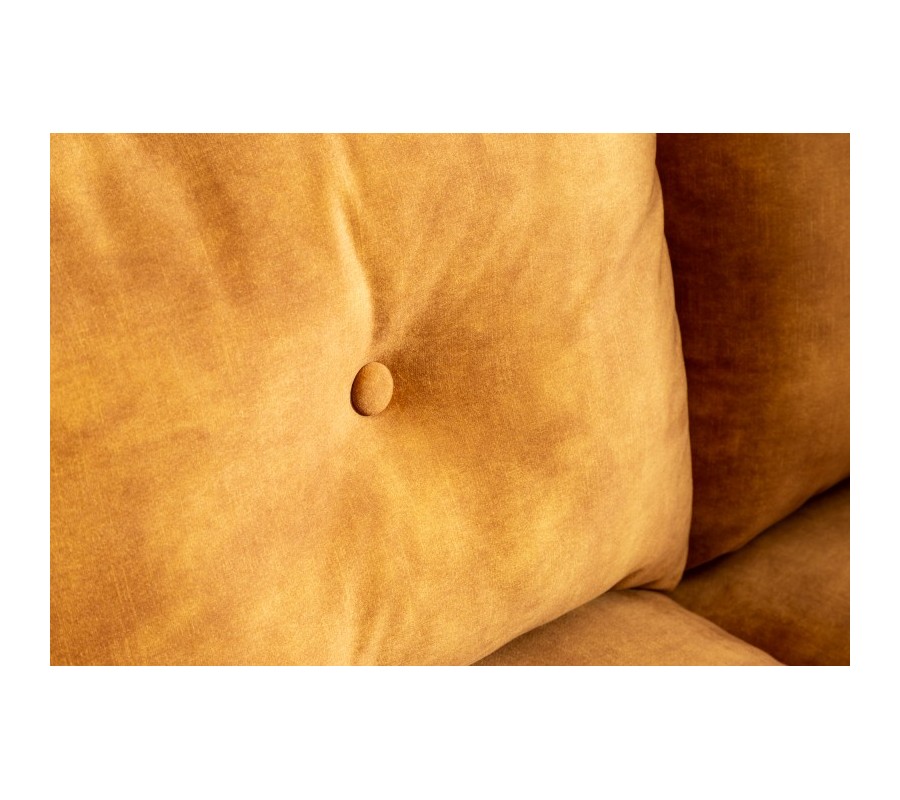 Nadčasový dizajn horčicovej žltej zamatovej sedačky Auxerre vnesie do každého interiéru moderného ducha s prvkami elegancie. Vďaka kombinácii s vysokými úzkymi nožičkami pôsobí odľahčene a nezaťažuje ani menší priestor. Kovové nohy sedačky s najnovším dizajnom v tlmených matných odtieňoch vytvárajú s jemným odleskom zamatového poťahu harmonický kontrast. Pohodlie počas sedu je zabezpečené pridanými vankúšmi na operadle a v kombinácii s pružinovým jadrom zabezpečuje komfort aj počas dlhého odpočinkového sedu. Rozmer sedačky je dostatočný pre pohodlné usadenie troch až štyroch osôb. Štýlová sedačka Auxerre sa stane dokonalým doplnením vašich moderných domácností či miestom na odpočinok v obľúbenom podniku či luxusnej čakárni. Výrazný horčicový poťah sedačky sa nemusíte báť kombinovať s farebnými textíliami či rozličnými vzormi s florálnym a geometrickým motívom.
