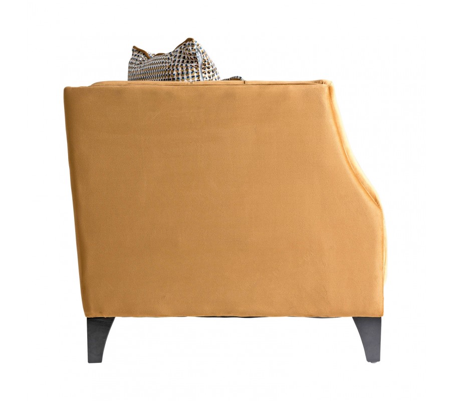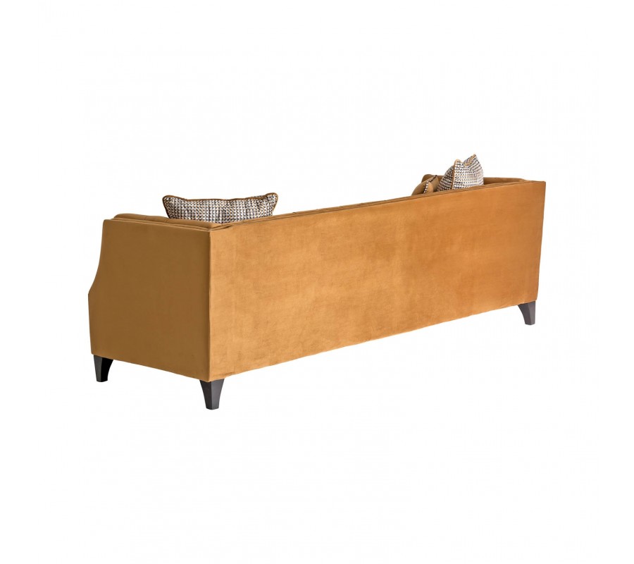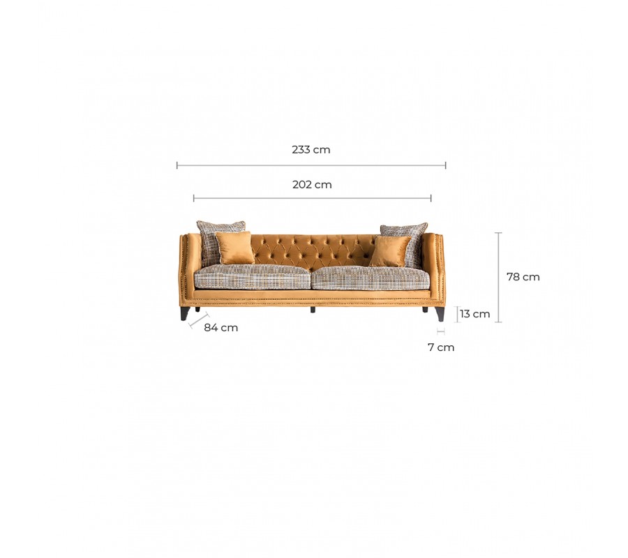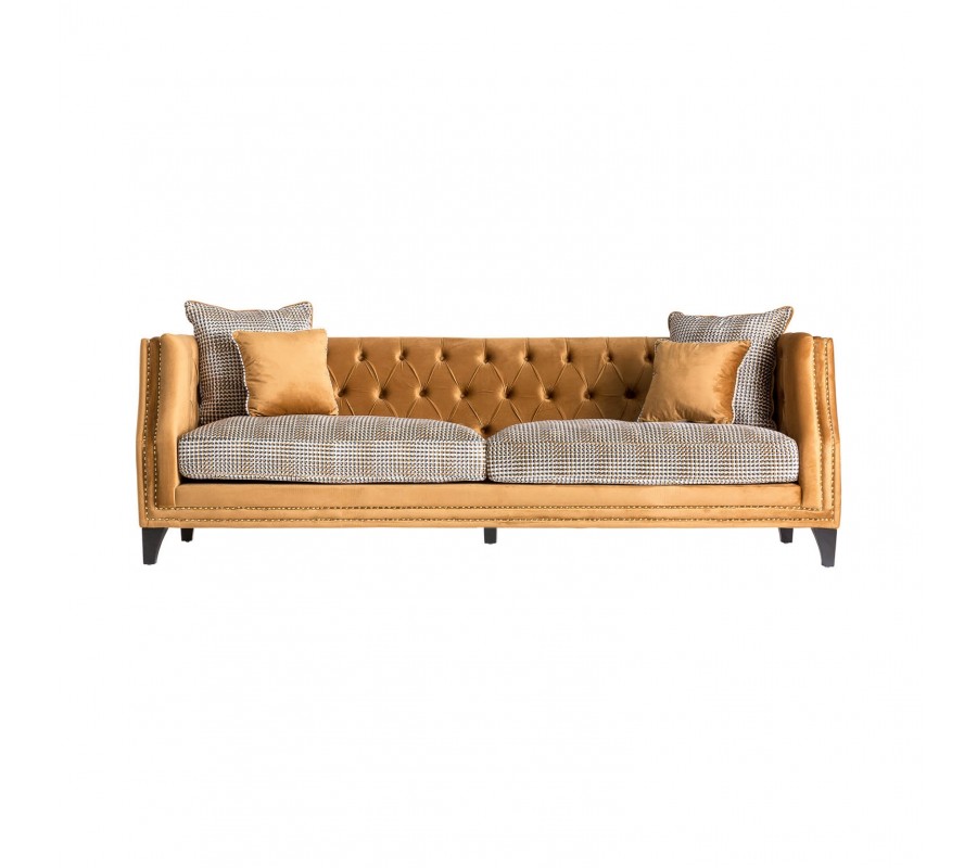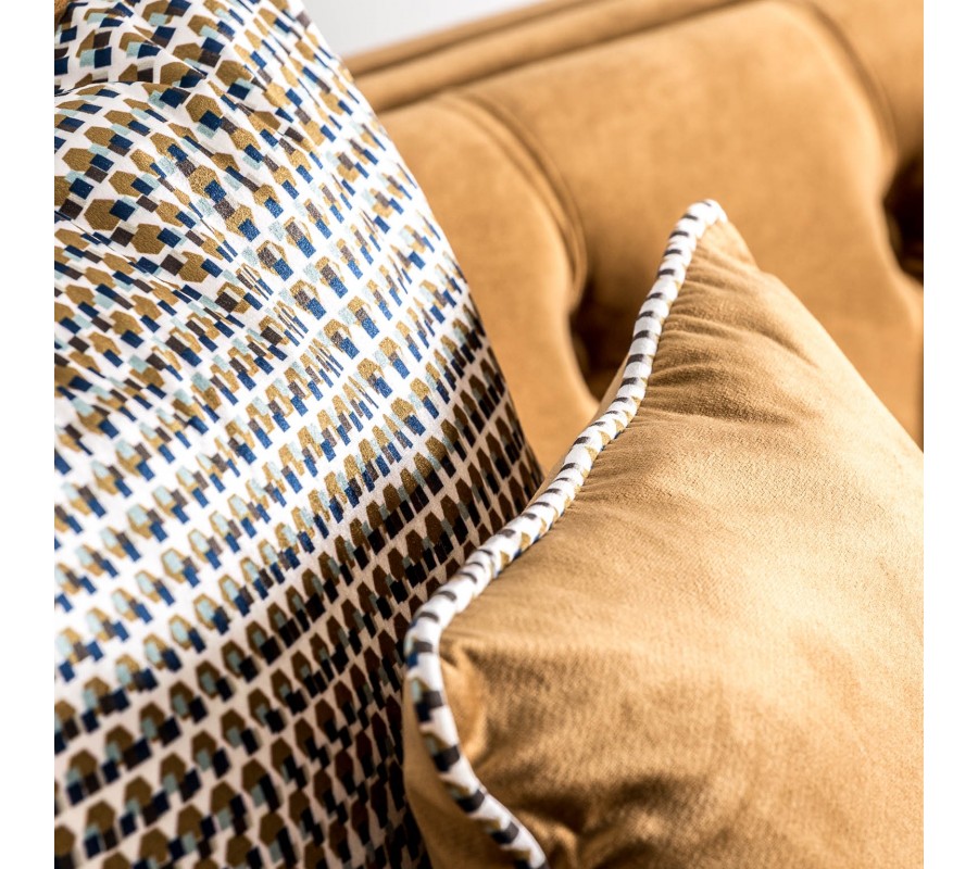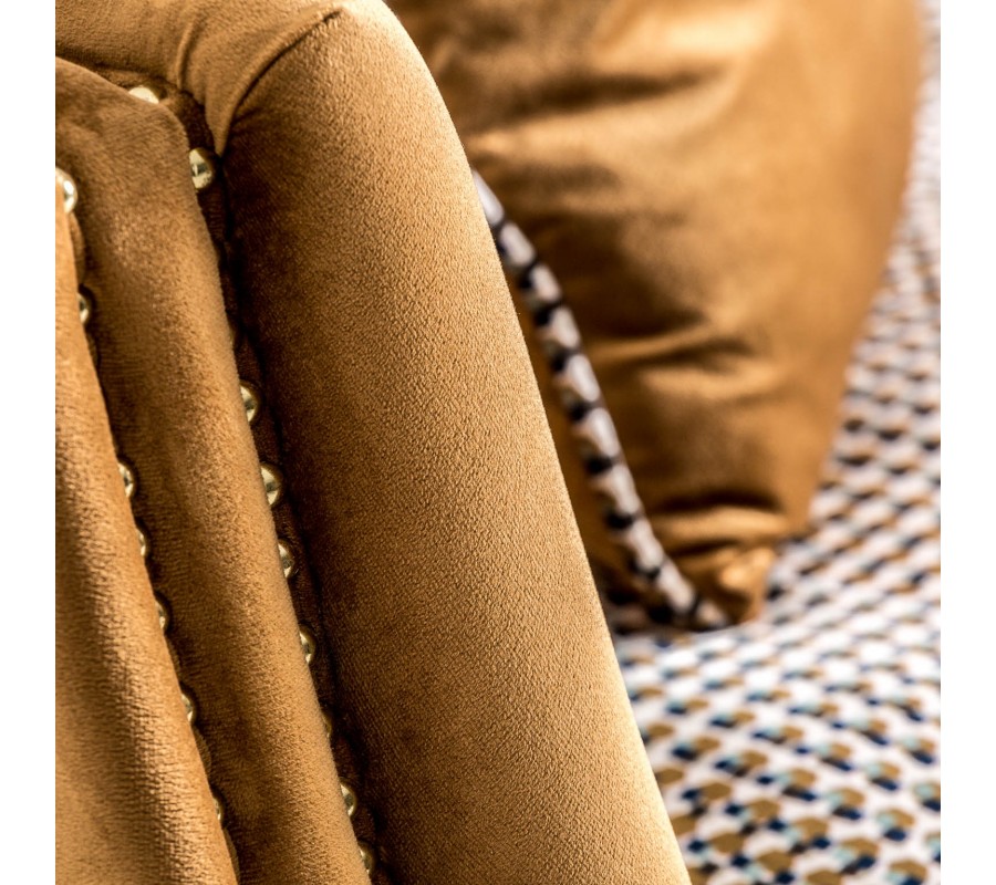 Luxusná prešívaná sedačka Brilon v Chesterfield štýle sa stane šperkom každého interiéru. Zlatistý odtieň zamatového poťahu sedačky je doplnený výrazným vzorom v geometrickom Art-deco štýle na pohodlnej sedacej časti. Mimoriadne vkusný detail v podobe zlatých prvkov lemujúcich šev pohovky podčiarkuje jej luxusnú povahu. Rozmer sedačky je dostatočný pre usadenie štyroch osôb. Okrem kvalitných prvkov z kameňa, masívneho dreva či lesklého kovu ju môžete kombinovať aj s ďalšími produktami z našej rovnomennej kolekcie Brilon.