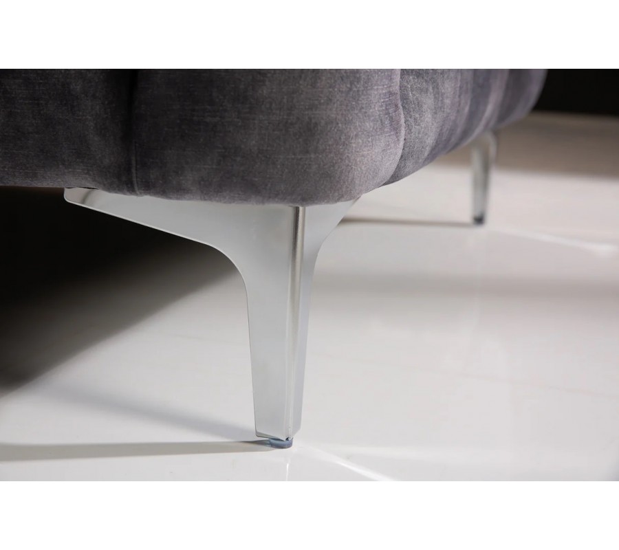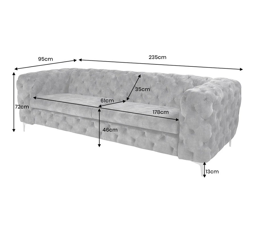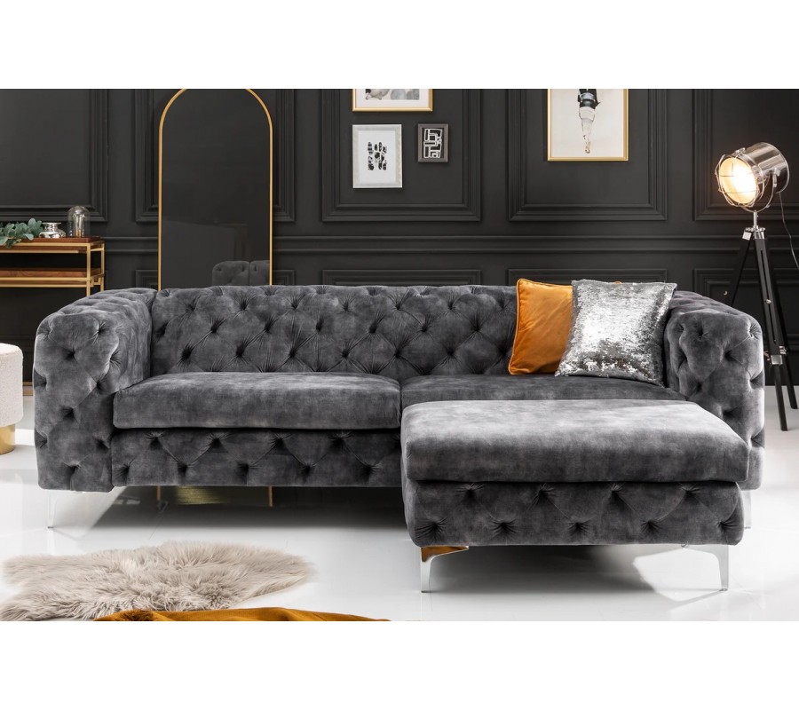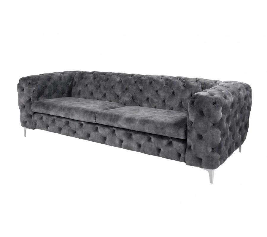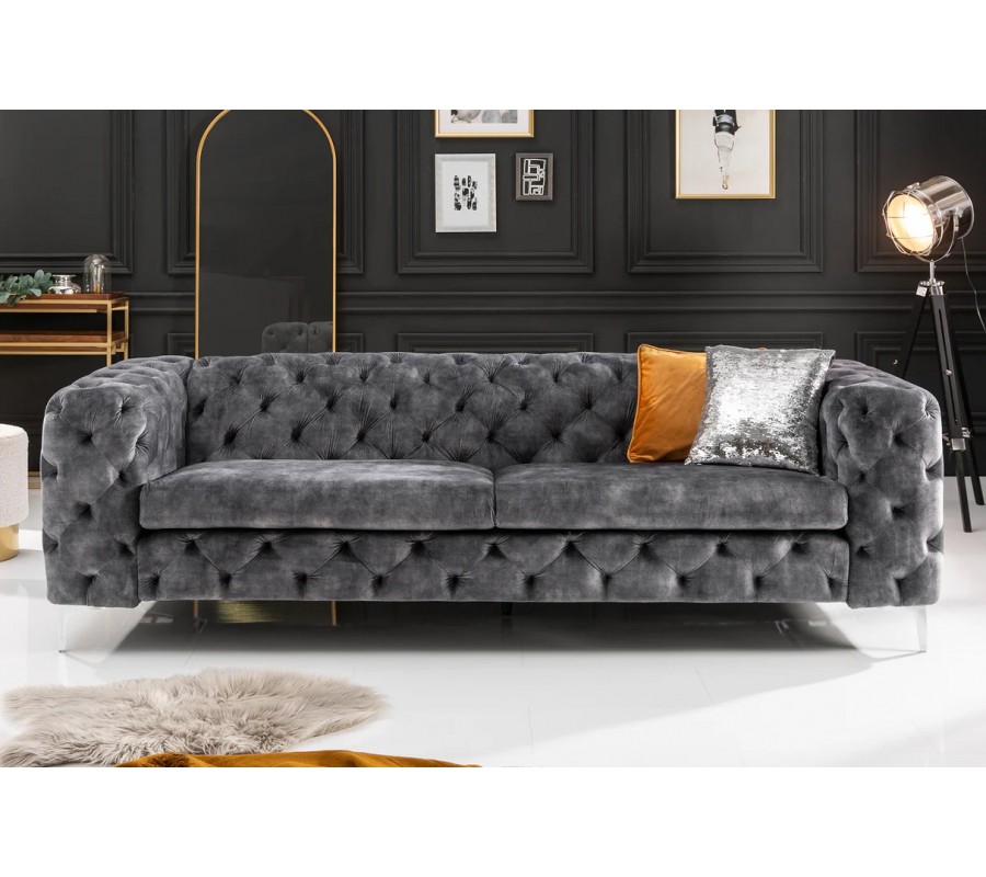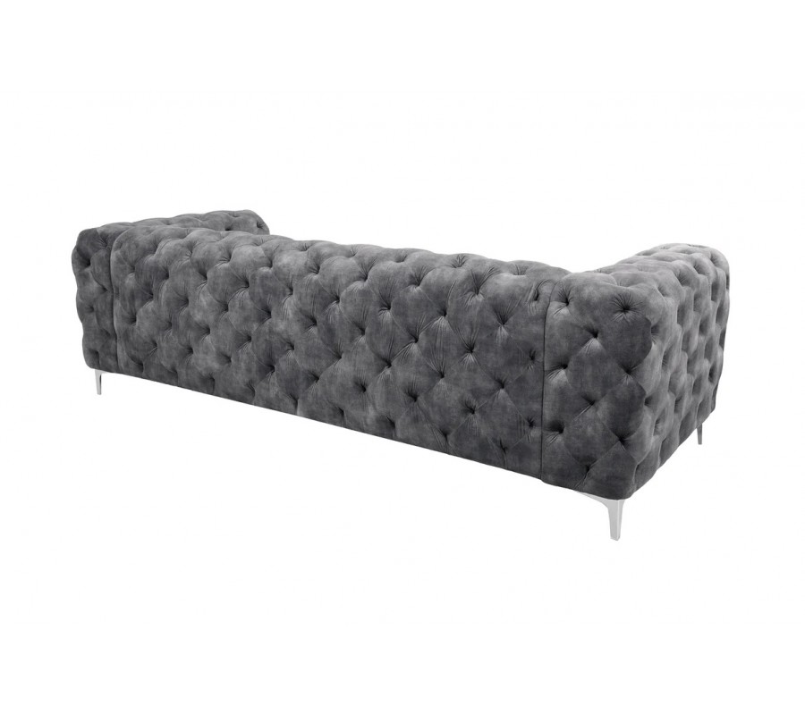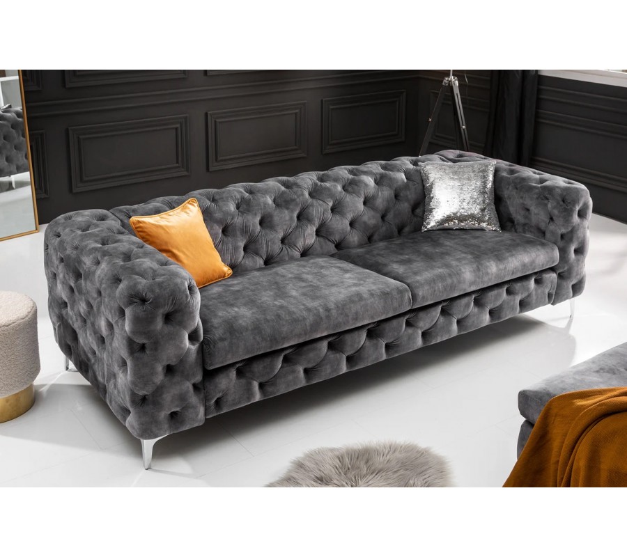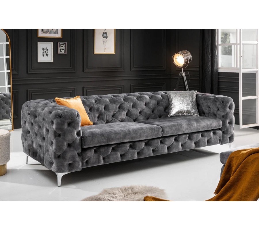 Celý povrch sedačky je potiahnutý jemným zamatovým poťahom v tmavosivej farbe, ktorý pôsobí mimoriadne elegantne, je príjemný na dotyk a dodáva priestoru luxusnú atmosféru. Charakteristické chesterfield prešívanie pokrýva operadlo, bočné časti aj čelnú plochu sedačky, čím vytvára bohatú štruktúru a nadčasový vzhľad inšpirovaný klasickým barokovým štýlom v modernom spracovaní.