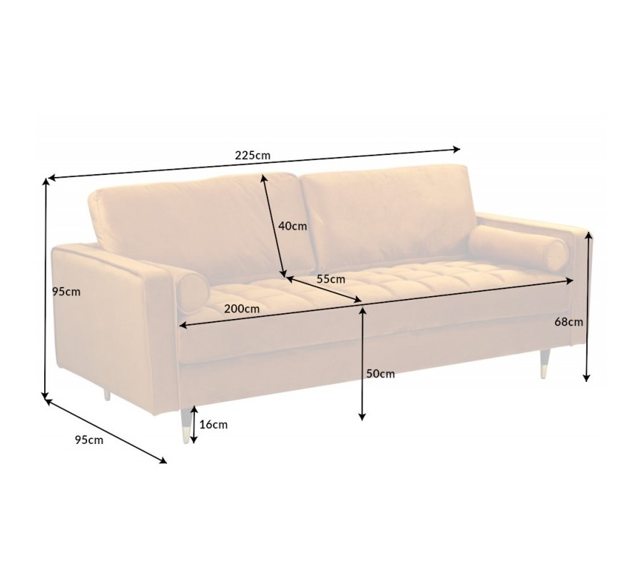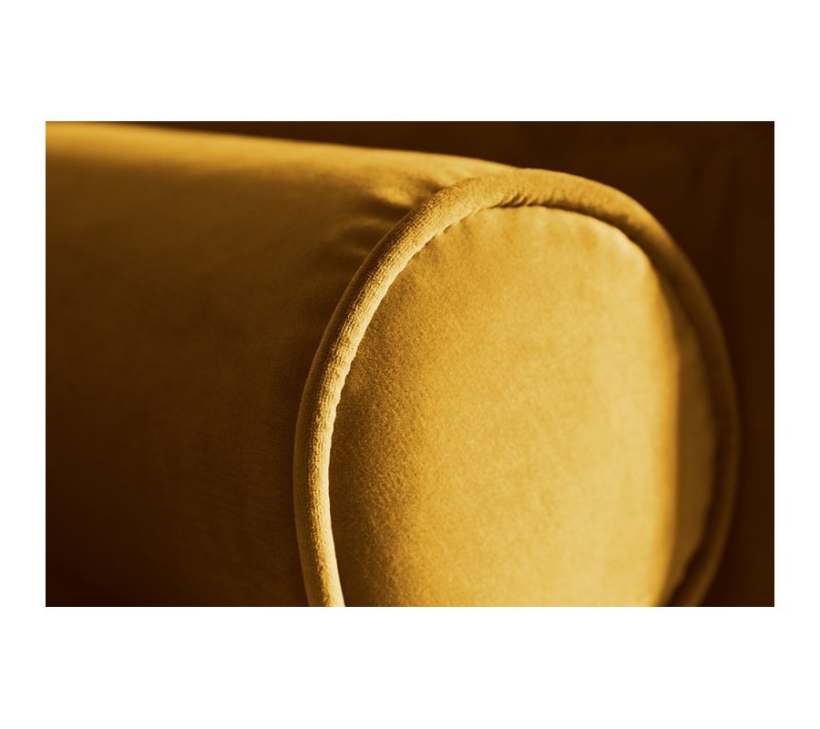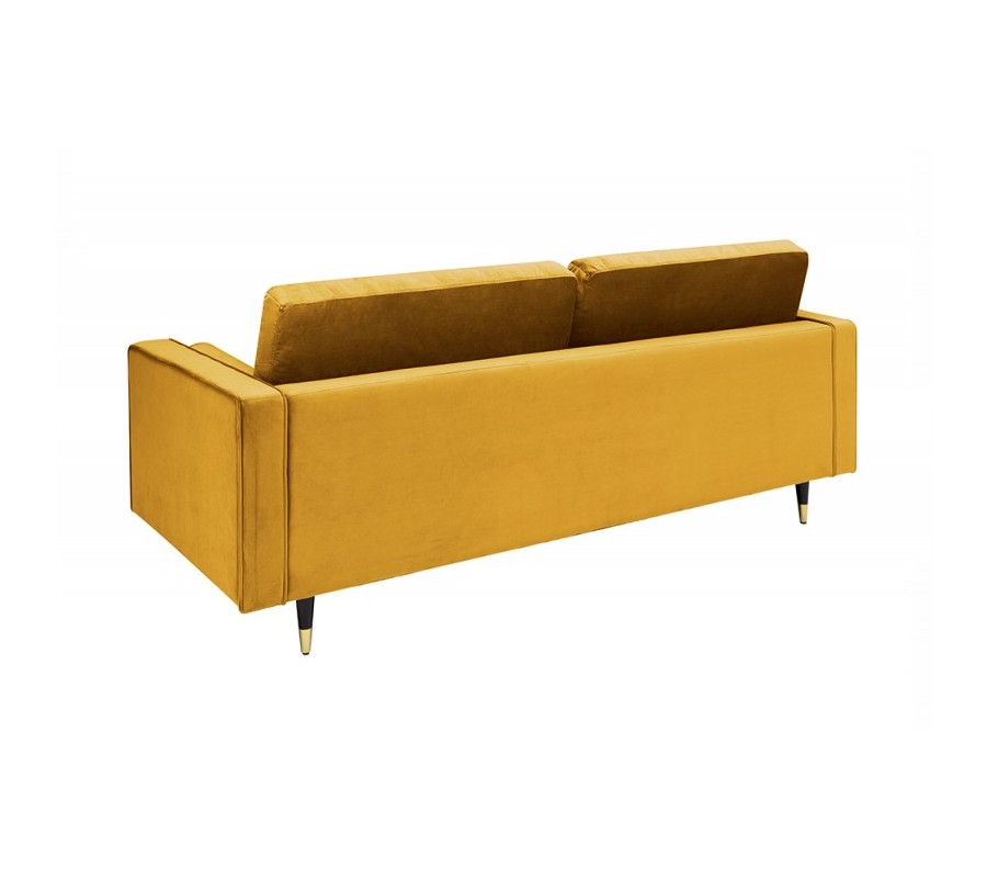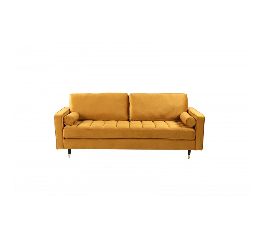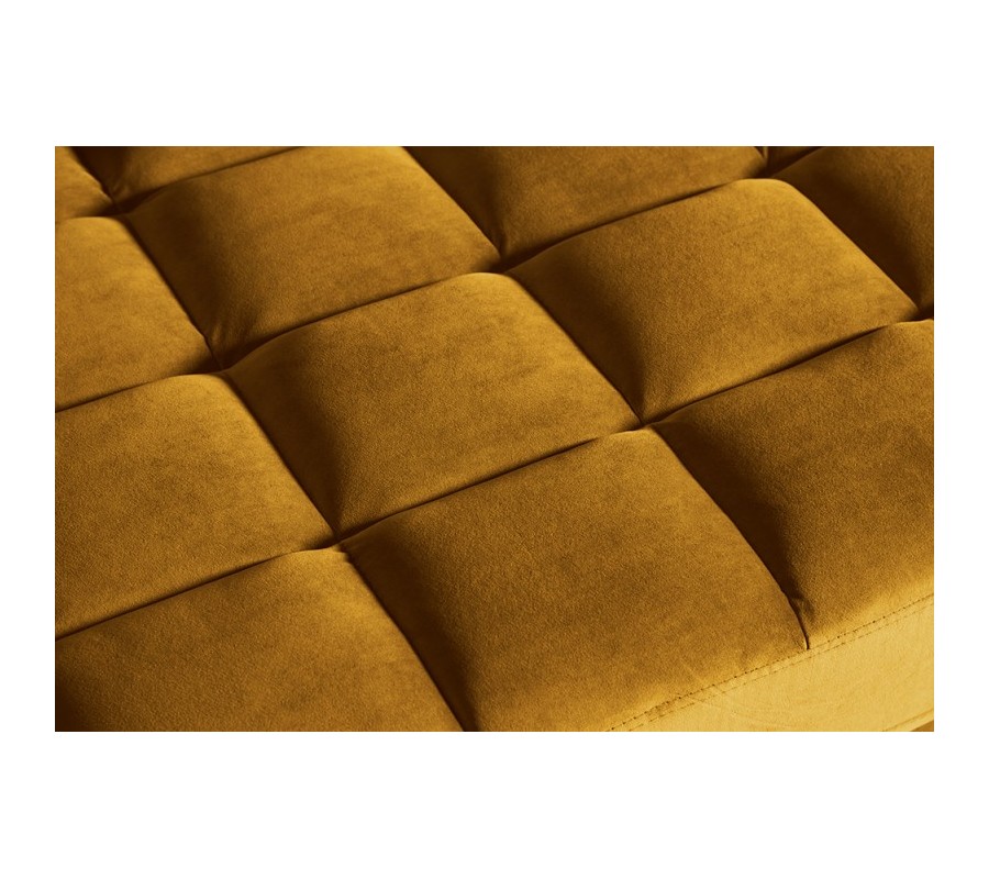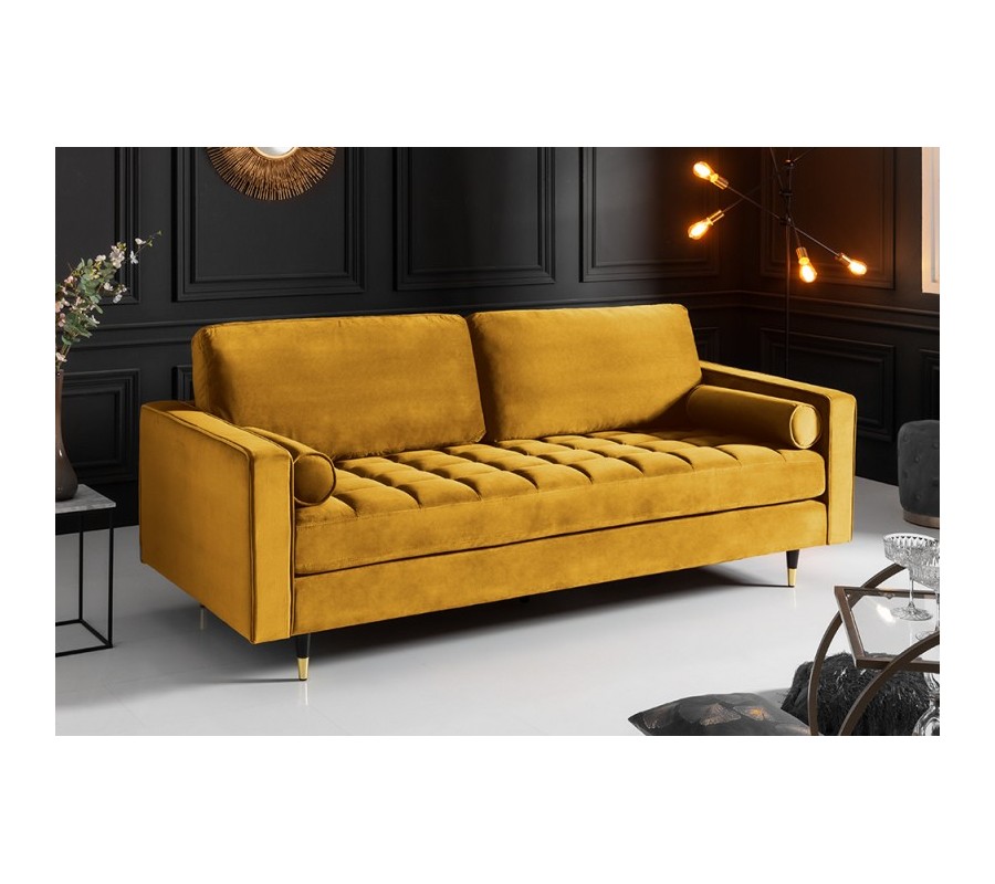 Štýlová zamatová sedačka Nefertiti v art-deco štýle je špecifická nielen svojou horčicovo žltou farbou, ale aj stabilným rámom z masívneho dreva v čiernej farbe a nožičkami so zlatým zakončením, ktoré dodávajú špecifický art-deco, ale zároveň aj moderný nádych tejto pohovke. Čalúnenie je v jednoduchom elegantnom prevedení a v spojení s matracom na sedacej časti, dvoma opierkami po krajoch sedačky a dvoma vankúšmi na chrbtovej opierke zaistia komfort a pohodlie pri sedení. Štvorcové prešívanie na samotnom matraci dodáva dizajnový dojem a tak sa sedačka dá výborne zladiť s retro, art-deco, ale aj moderným interiérom, a taktiež aj v kombinácií s jemnými kovovými doplnkami osvieži či už tmavo alebo svetlo zariadené priestory.