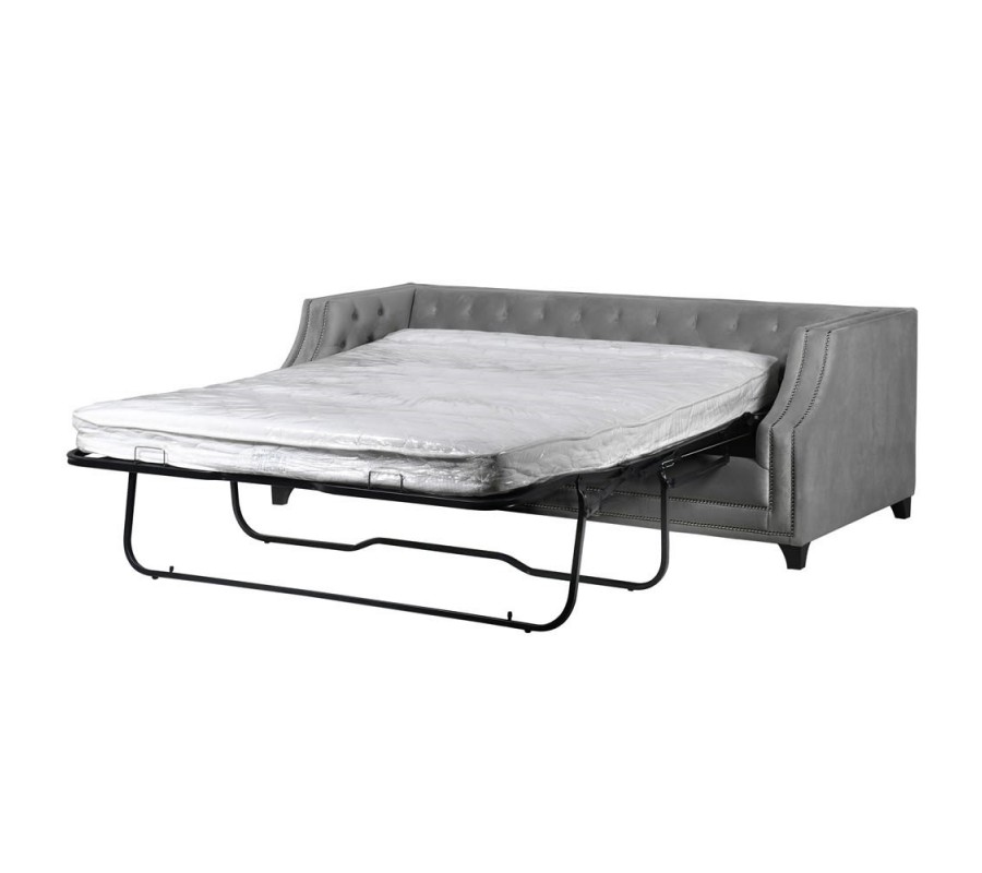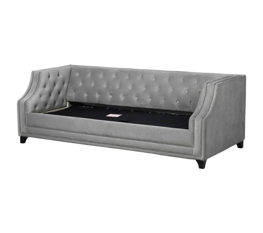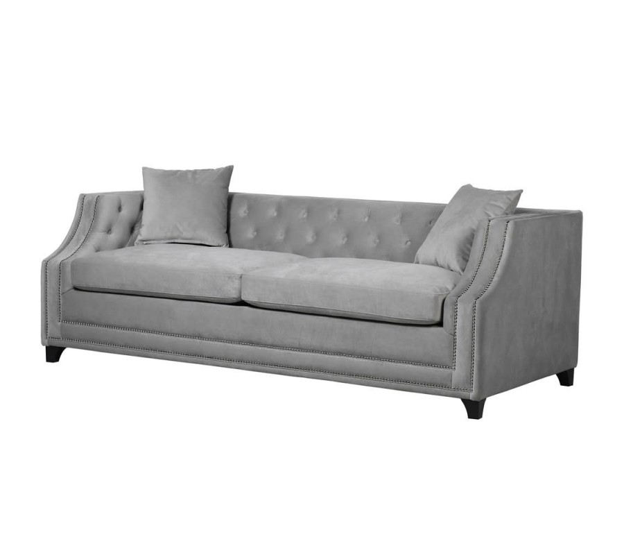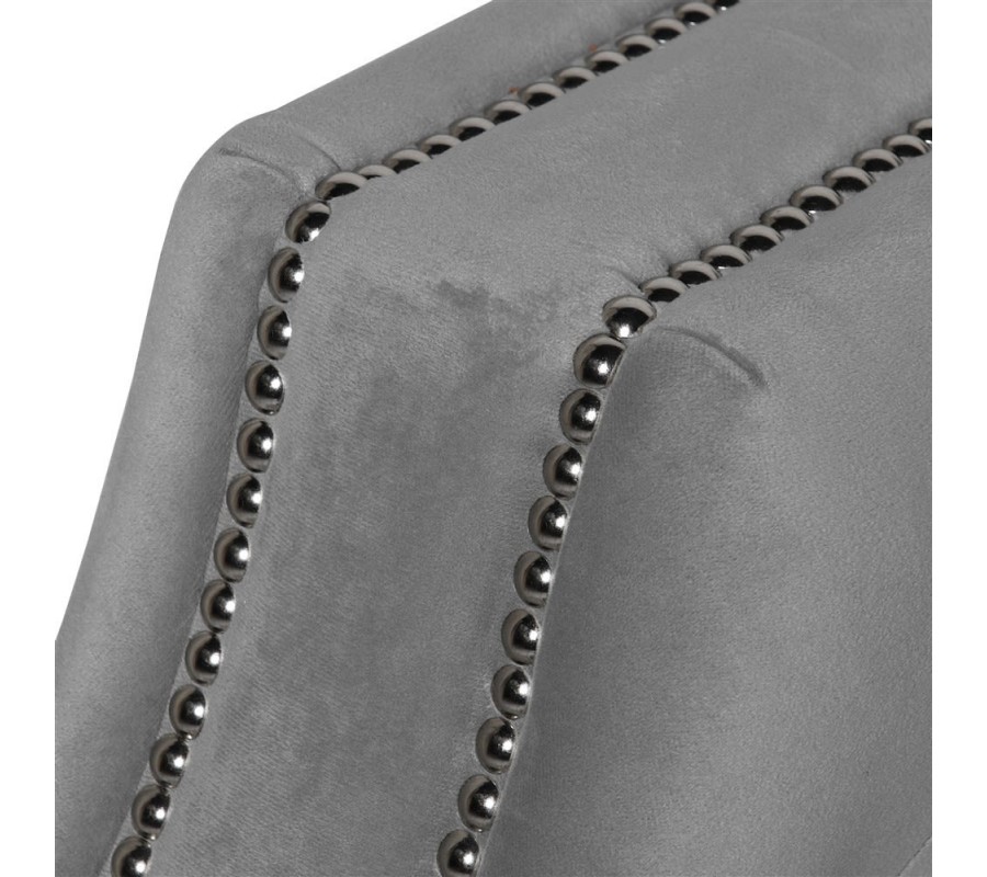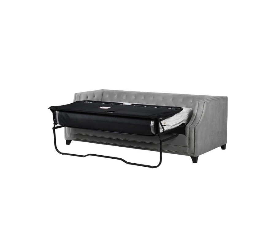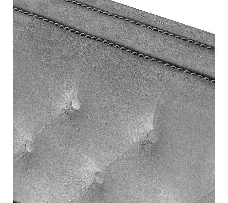 Luxusná Art-Deco prešívaná sedačka v Chesterfield štýle sa zaručene stane stredobodom Vášho interiéru. Zamatové prešívané čalúnenie opierok v svetlosivej farbe v kombinácii s nitmi v striebornej farbe vytvárajúcimi elegantnú líniu pozdĺž rámu sedačky dodáva sedačke pôvabný nádych luxusu. Pohodlná sedacia časť ponúka dostatok priestoru pre usadenie troch osôb. Táto Chesterfield sedačka ponúka možnost rozloženia sedacej časti a tým vytvorenie dostatku priestoru na oddych alebo spánok pre dve dospelé osoby, vďaka čomu sa stane nielen vkusným ale aj praktickým prvkom Vašej domácnosti. Celková hĺbka sedačky po rozložení dosahuje až 225cm. Sedačka je umiestnená na štyroch čiernych tvarovaných nožičkách, ktoré jej dodávajú elegantný nádych a stabilitu.