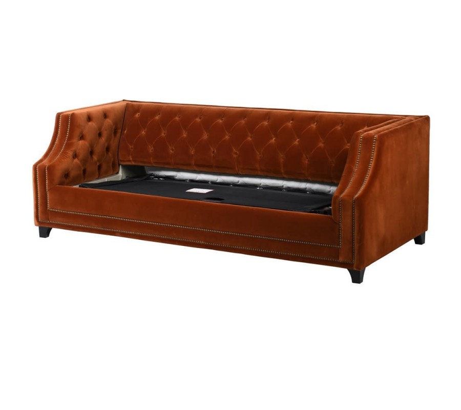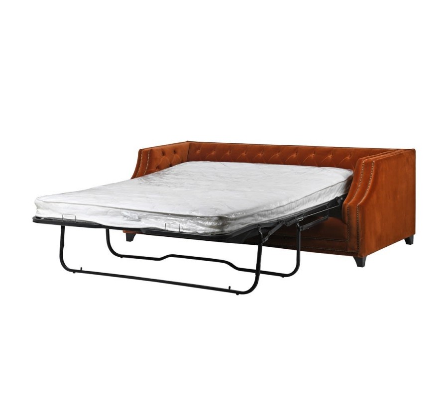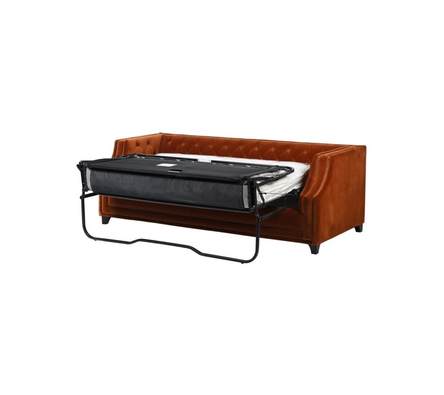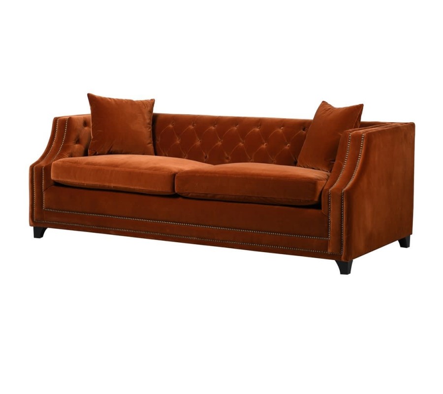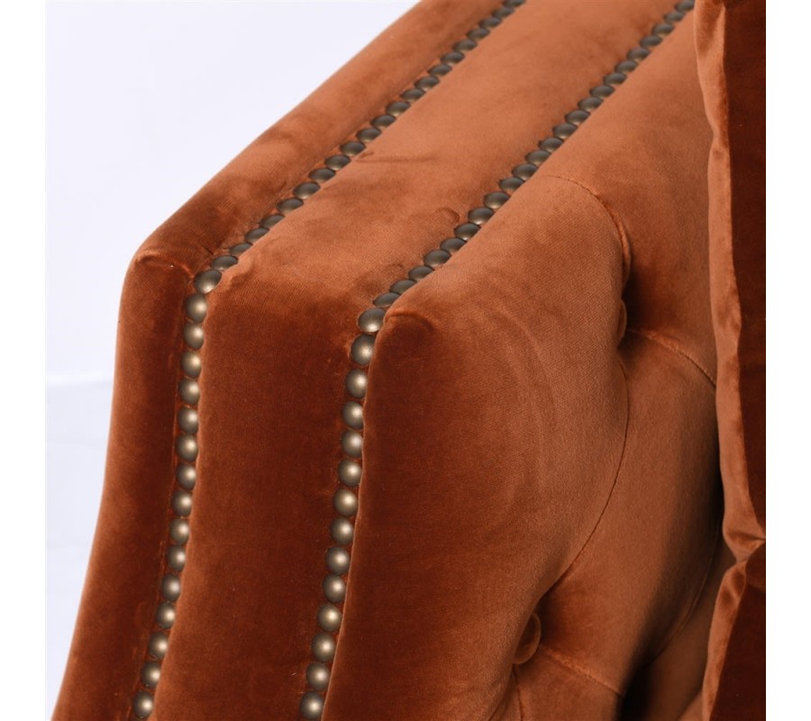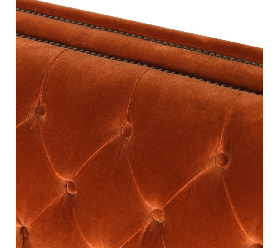 Luxusná Chesterfield prešívaná dvojsedačka v Art-Deco štýle zaručene upúta pohľad nejedného návštevníka Vašej domácnosti. Zamatové prešívané čalúnenie opierok v tehlovej farbe v kombinácii s nitmi v medenej farbe vytvárajúcimi elegantnú líniu pozdĺž rámu sedačky dodáva sedačke pôvabný nádych luxusu. Pohodlná sedacia časť ponúka dostatok priestoru pre usadenie troch osôb. Táto Chesterfield sedačka ponúka možnosť rozloženia sedacej časti, dosahujúc tak po rozložení hĺbku 225cm, čím vytvára dostatku priestoru na oddych alebo spánok pre dve dospelé osoby, vďaka čomu sa stane nielen vkusným ale aj praktickým prvkom Vašej domácnosti. Sedačka je umiestnená na štyroch čiernych tvarovaných nožičkách, ktoré jej dodávajú nádych elegancie a stabilitu.