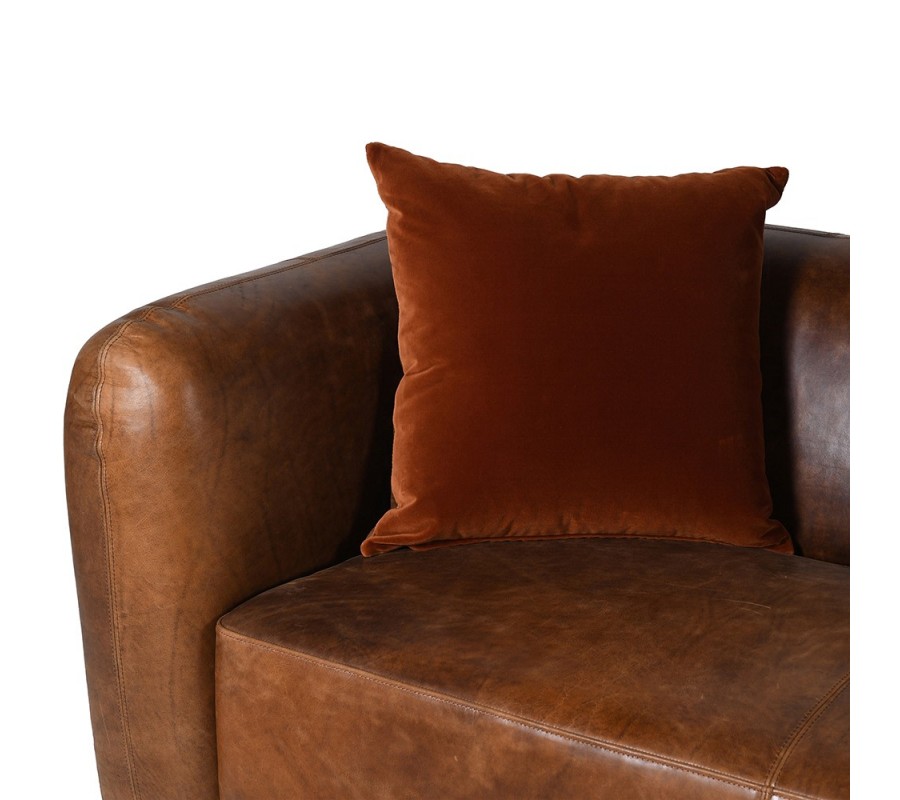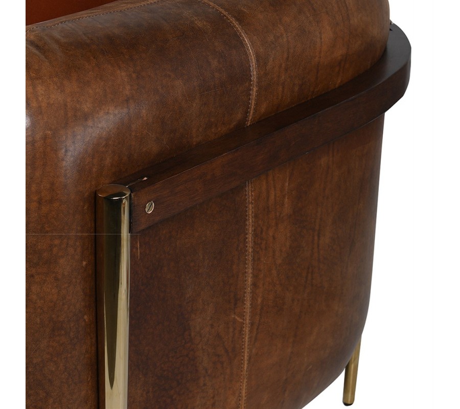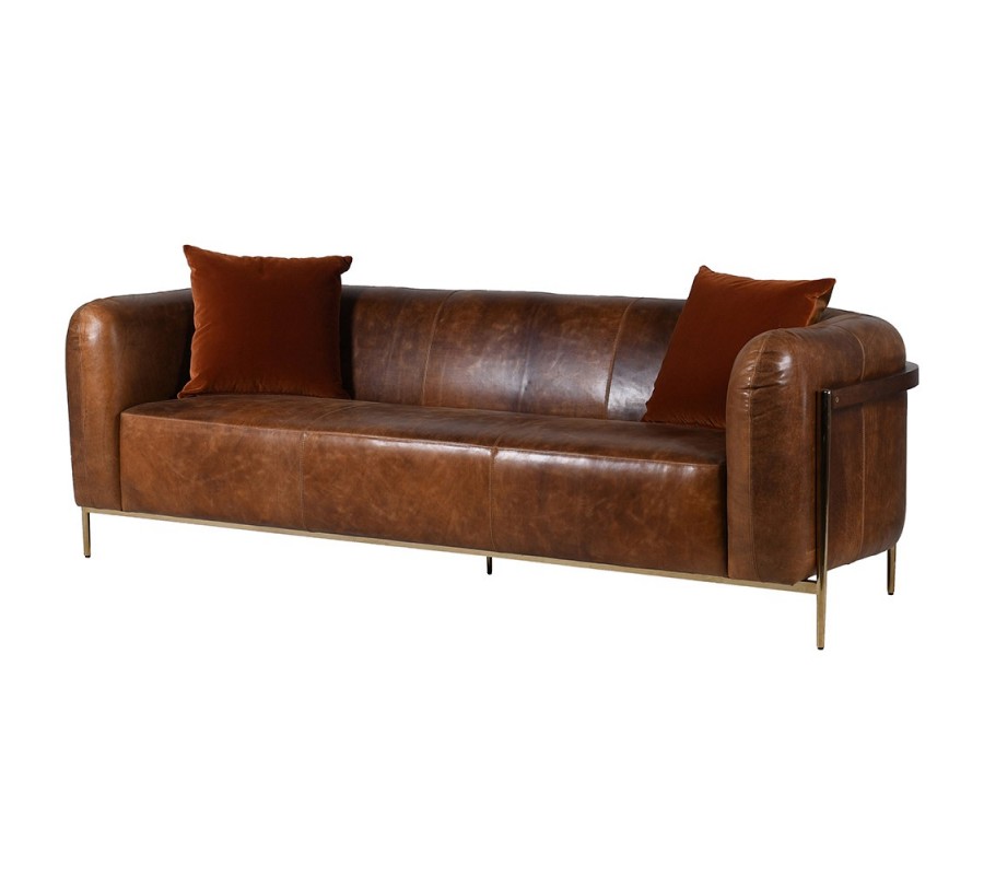 Jedinečná sedačka Leatheriva vo vintage koženom čalúnení vysoko kvalitným 100%-ným pravým koženým vyhotovením, ktoré vás presvedčí o výnimočnosti tohto produktu. Základom trojsedačky je kovová podstava v zlatej farbe, obohatená o jednu čiernu opornú nožičku a štyri nožičky v zlatom farebnom prevedení, ktoré dodávajú nádych art-deco štýlu. Kovový rám je popri zadnej opierke spájaný orechovo hnedým masívom, pričom kožené čalúnenie sa nachádza aj na zadnej strane sedačky, čo umožnuje jej umiestnenie do priestoru. Trojsedačke Leatheriva dominujú oblé plynulé tvary na opierkach, pričom sedačka taktiež disponuje bohatým polstrovaním na sedacej časti a na bočných a chrbtových opierkách, čo vám zaručí maximálny komfort pri sedení. Ako doplnok pre túto sedačku je pár zamatových vankúšov v hrdzavo hnedej farbe. Luxusná kožená trojsedačka Leatherivasa vďaka svojmu kvalitnému vyhotoveniu môže stať reprezentatívnym kúskom vo vašom interiéri, alebo priestoroch firiem, podnikov či hotelov vo vintage štýle.