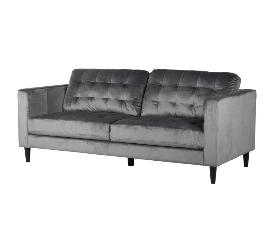 Štýlová moderná trojsedačka Faux s tmavo sivým flanelovým zamatovým čalúnením vám ponúka jednoduchý a ľahko kombinovateľný moderný dizajn a veľmi príjemné a pohodlné sedenie s vašimi blízkymi. Flanelové zamatové čalúnenie v tmavo sivej farbe je nielen príjemné na dotyk, ale taktiež aj na pohľad, najmä keď je obohatené o štvorcové prešívanie ako na chrbtovej poduške alebo na bohato polstrovanom podsedáku. Trojsedačka Faux disponuje bočnými opierkami, ktoré sú v jednej vodorovnej línií s chrbtovou opierkou, čo dodáva elegantný pocit zo sedačky. Tmavo sivé čalúnenie je doplnené čiernymi masívnymi nožičkami, ktoré ponúkajú jednoduchú kombinovateľnosť napríklad s čiernymi konferenčnými stolíkmi, s čiernymi alebo striebornými dekoráciami, a taktiež s nábytkom v modernom svetlom a bielom vyhotovení.