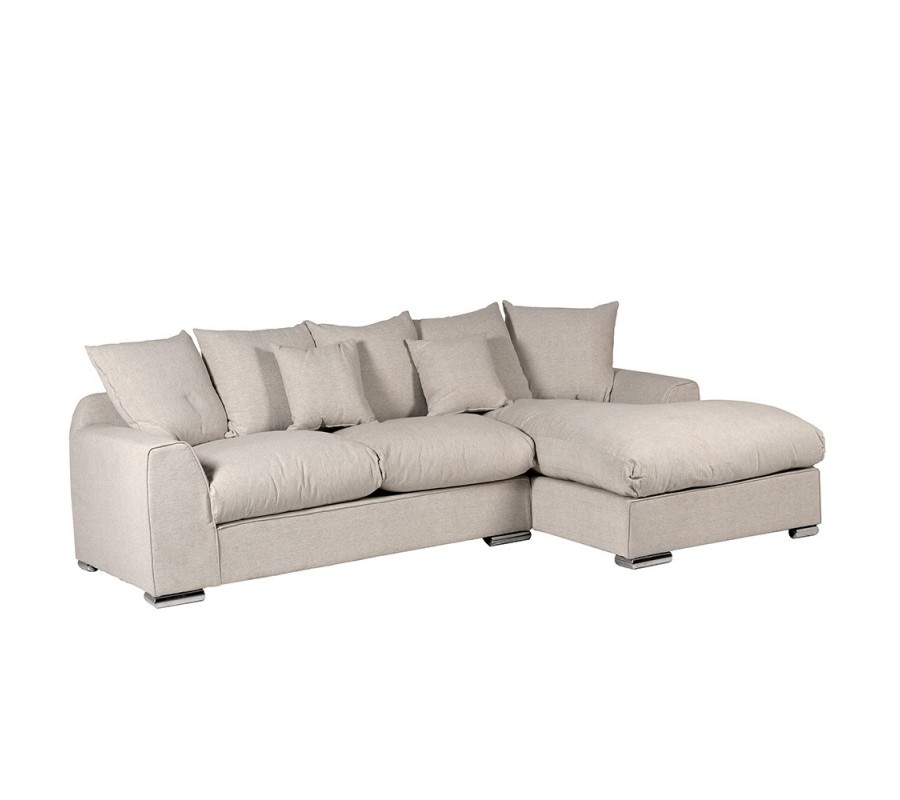 Luxusná sedačka Vyra v modernom štýle je kúskom, ktorý si priam zamilujete, či už kvôli komfortu a trvácnosti, ktorú vám ponúkne, alebo kvôli ľahko kombinovateľnému dizajnu, ktorý vynikne v každom modernom interiéri. Čalúnenie rohovej sedačky Vyra je v teplej sivej až béžovej farbe, pričom zloženie čalúnenia je z kombinácie ľanu a bavlny. Komfort, ktorý ponúka rohová sedačka Vyra je dosiahnutý prostredníctvom siedmych odnímateľných vankúšov a troma bohato polstrovanými podsedákmi, vďaka ktorým nebudete chcieť vstať zo sedačky Vyra. Dizajn je v neposlednom rade doplnený kovovými nožičkami v striebornej farbe. Trvácnosť sedačky Vyra zaručí konštrukcia z masívneho dreva a spomenuté kvalitné materiály čalúnenia. Vďaka svojmu farebne neutrálnemu modernému dizajnu je rohová sedačka Vyra veľmi ľahko kombinovateľná v moderných interiéroch, napríklad v kombinácií so živou zeleňou s bielymi konferenčnými stolíkmi, alebo s kobercami v jemných svetlých farbách s dlhým vlasom.