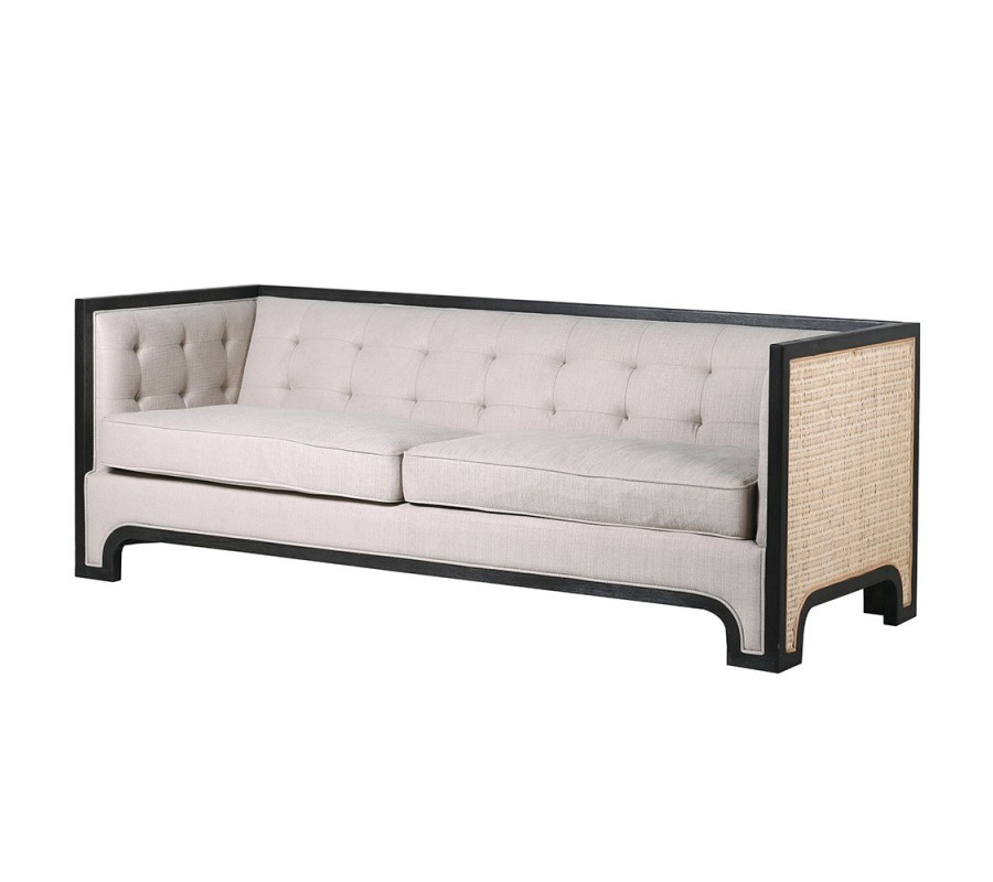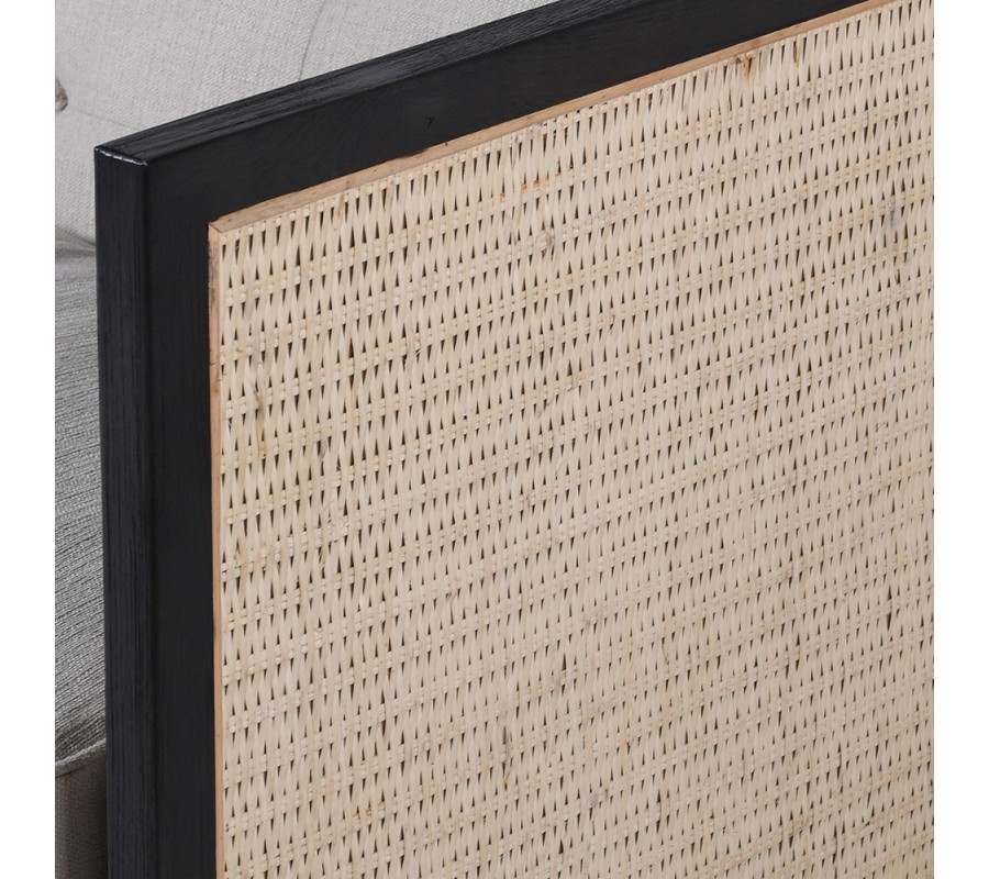 Art-deco luxusná trojsedačka Zenith v sivom čalúnení s čiernym kovovým rámom a svetlo hnedým ratanovým výpletom 200cm